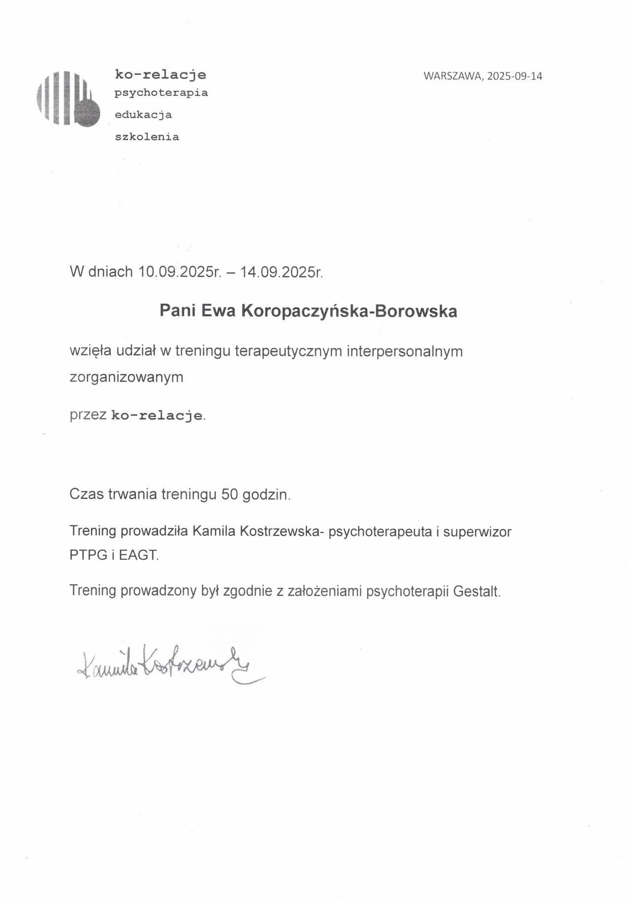 Dbając o jakość swej pracy i bezpieczeństwo moich Klientów poddaję ją regularnej superwizji i interwizji.
