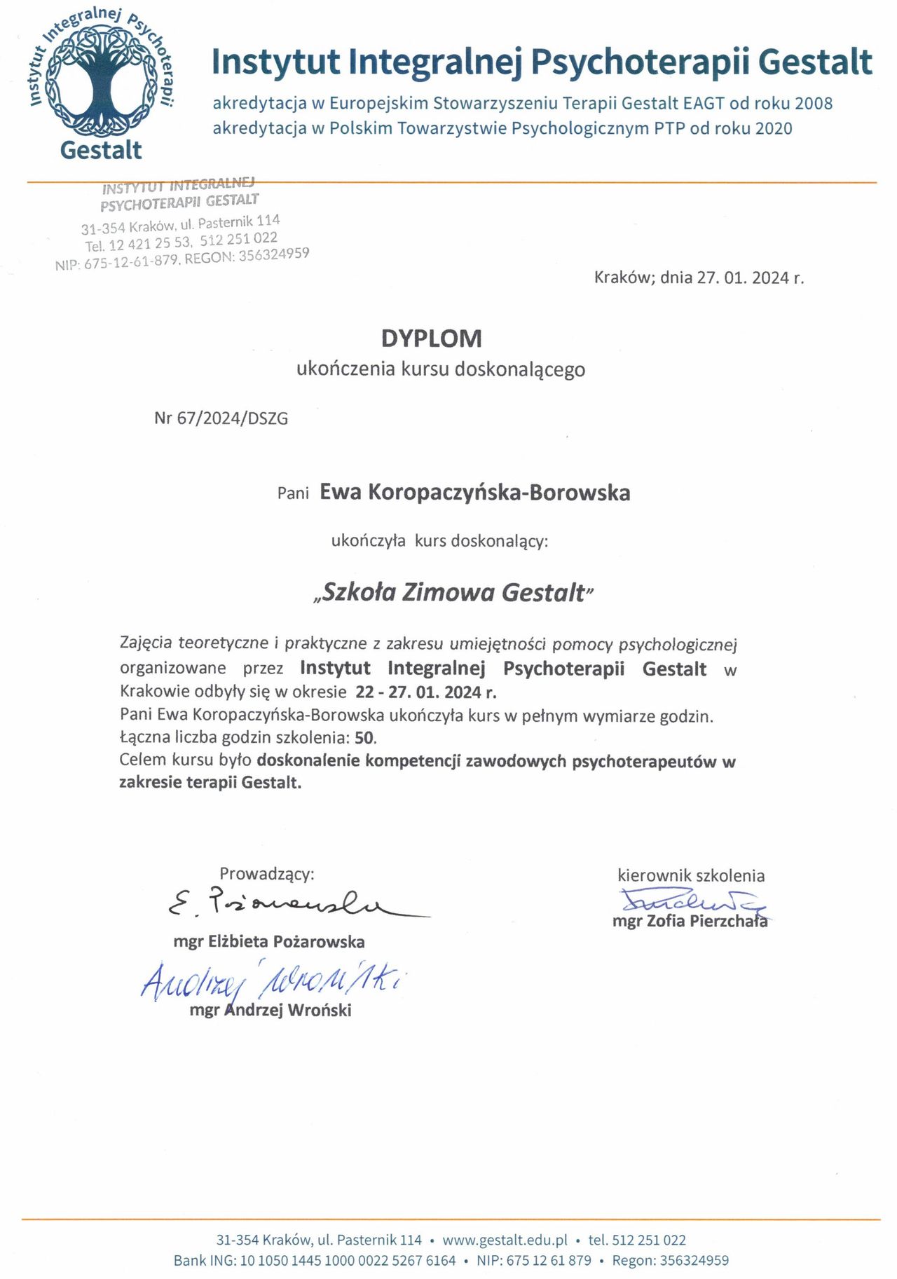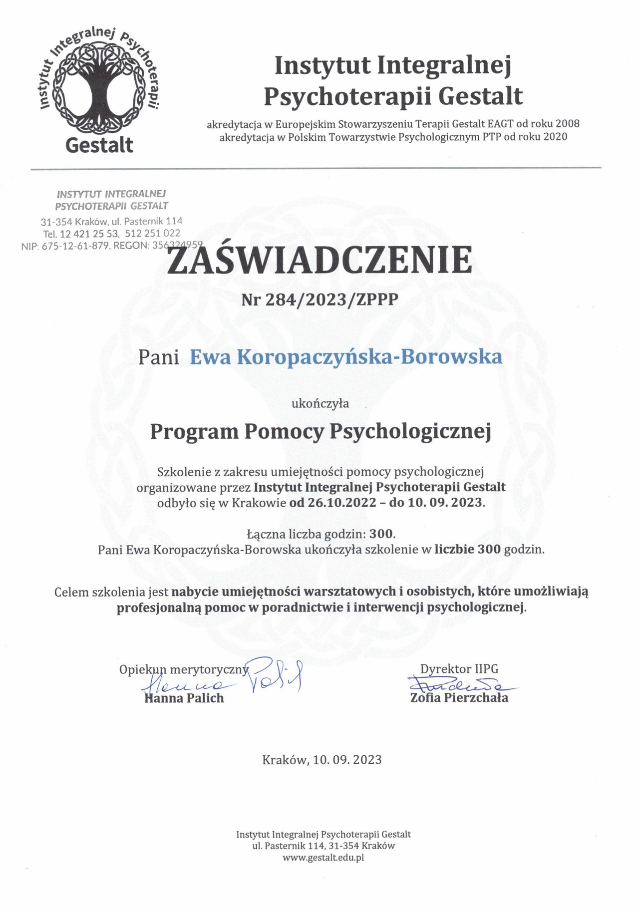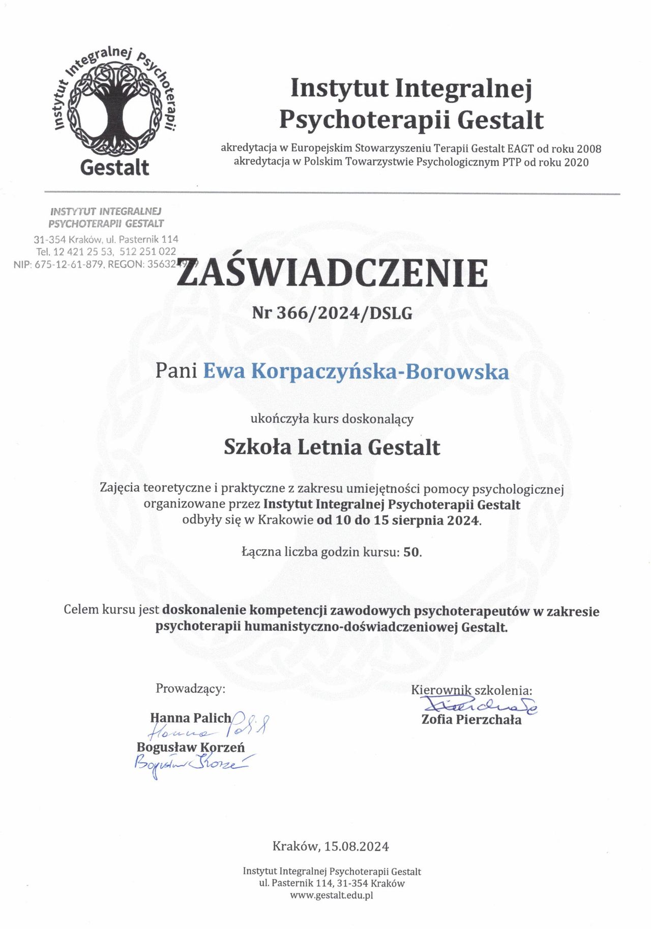 Ukończyłam studia magisterskie w zakresie nauk humanistycznych a także w zakresie nauk społecznych. Obecnie kontynuuję naukę w czteroletniej Szkole Psychoterapeutów w krakowskim Instytucie Integralnej Psychoterapii Gestalt, który jest w pełni akredytowanym ośrodkiem szkoleniowycm (PTPG, ETPG, PTP, ESP). Ukończyłam kurs MBSR (Mindfulness Based Stress Reduction) Redukcji Stresu opartej na Uważności.