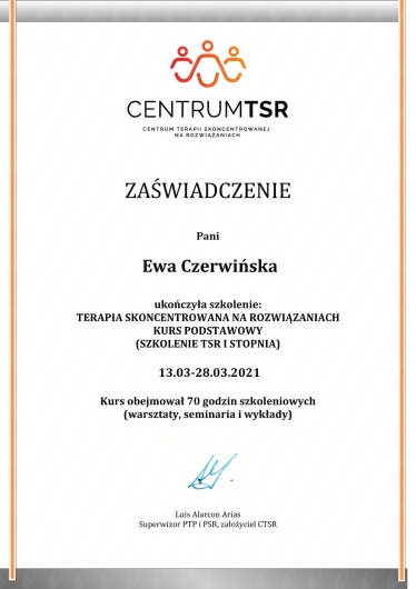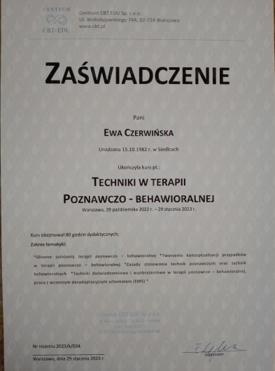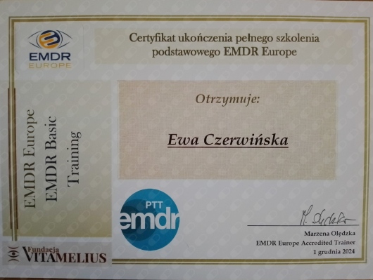 Jestem psychologiem specjalności klinicznej oraz członkiem Polskiego Towarzystwa Terapii EMDR. Tytuł magistra psychologii uzyskałam na Wydziale Psychologii Uniwersytetu Humanistyczno - Społecznego SWPS w Warszawie ze specjalnością Psychologia kliniczna i zdrowia. Ukończyłam również podyplomowe studia o specjalności Praktyczna psychologia społeczna na Uniwersytecie Humanistyczno - Społecznym SWPS w Warszawie. Jestem absolwentką pełnego szkolenia podstawowego EMDR Europe oraz kursu I i II stopnia Terapii Skoncentrowanej na Rozwiązaniach w CTSR w Warszawie. Kontynuuję naukę w czteroletniej Szkole Psychoterapii EMDR.
