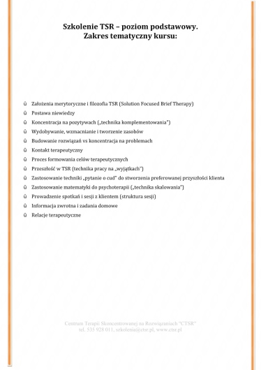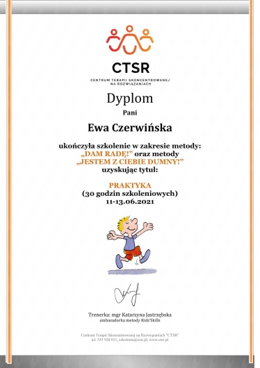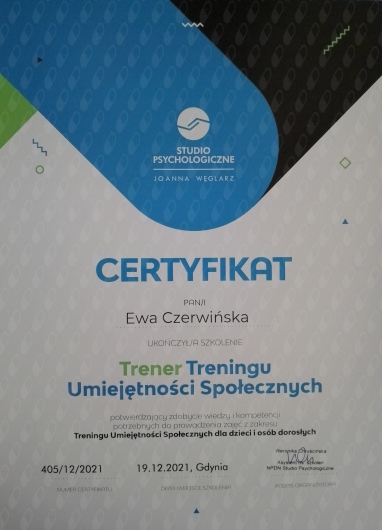 Ukończyłam kurs metody Kids’Skills („Dam radę” oraz „Jestem z Ciebie dumny”) uzyskując tytuł praktyka. Jestem również trenerem Treningu Umiejętności Społecznych (TUS) dla dzieci i dorosłych oraz dla osób z autyzmem oraz zespołem Aspergera.