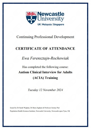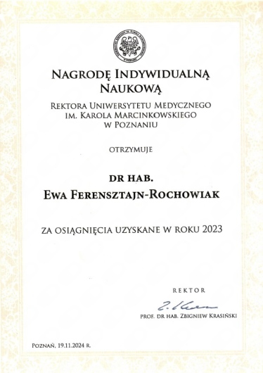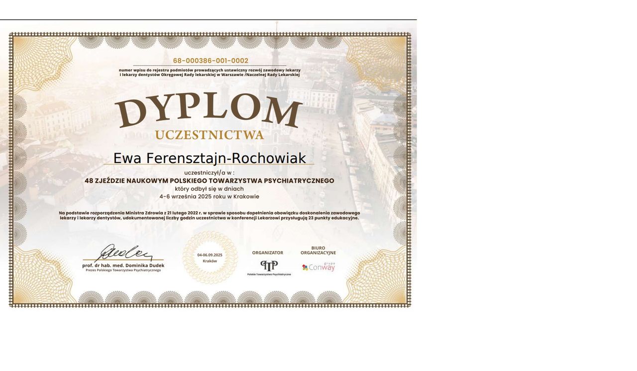 Specjalista psychiatra. Od 2011 roku pracuje na oddziałach psychiatrycznych Szpitala Klinicznego im. K. Jonschera w Poznaniu, w tym pierwsze 8 lat na specjalistycznym oddziale leczenia osób z zaburzeniami nastroju (afektywnymi). Od 2013 roku jest zatrudniona w Klinice Psychiatrii Dorosłych Uniwersytetu Medycznego w Poznaniu, obecnie na stanowisku adiunkta. W 2014 roku uzyskała z wyróżnieniem tytuł doktora nauk medycznych za pracę na temat choroby afektywnej dwubiegunowej występującej rodzinnie. W 2021 roku uzyskała tytuł doktora habilitowanego za pierwsze na świecie badania nad komórkami macierzystymi u pacjentów z chorobą afektywną dwubiegunową. Autorka i współautorka wielu prac z zakresu neurobiologii i leczenia chorób afektywnych. Za działalność naukową zdobyła trzykrotnie nagrodę Rektora Uniwersytetu Medycznego w Poznaniu. Jest kierownikiem Pracowni Zaburzeń Afektywnych (PZA) w Klinice Psychiatrii Dorosłych UMP, gdzie obecnie prowadzi badania naukowe m.in. dotyczące temperamentu tzw. wysokiej wrażliwości i jego związku z zaburzeniami nastroju i lękowymi, a także przetwarzania sensorycznego. Skarbnik i Członek Zarządu Oddziału Wielkopolsko-Lubuskiego Polskiego Towarzystwa Psychiatrycznego. Polski koordynator z ramienia Uniwersytetu Medycznego międzynarodowego programu dotyczącego depresji - PROMPT - Precision Medicine Depression Treatment. Uczestniczyła w projekcie Uniwersytetu Medycznego we współpracy z Norwegią dotyczącym zdrowia psychicznego kobiet w okresie okołoporodowym. W 2022 roku ukończyła kurs podstawowy szkolenia psychoterapeutycznego we Wrocławskim Instytucie Psychoterapii, uzyskując międzynarodowy tytuł konsultanta ds. psychoterapii pozytywnej, wydany przez Światowe Towarzystwo Psychoterapii Pozytywnej. Członkini Polskiego Towarzystwa Psychoterapii Stosowanej. Certyfikowany diagnosta narzędzia ADI-R - Wywiadu do diagnozy autyzmu - wersja zrewidowana. Ukończyła szkolenie ADOS-2 (protokół obserwacji do diagnozowania zaburzeń ze spektrum autyzmu) oraz ACIA - Autism Clinical Interview for Adults, a także specjalistyczne szkolenie związane z profilem autyzmu tzw. PDA (Pathological Demand Avoidance) - Working with and supporting PDA children Healthcare Practitioners. Działa w fundacji na rzecz neuroróżnorodności - Atypika. Wykłada na studiach podyplomowych "Neuroróżnorodność w miejscu pracy" na Uniwersytecie SWPS w Warszawie. Doświadczenie zawodowe zdobywała, pracując m.in. w trybie ostro dyżurowym w Izbie Przyjęć Kliniki Psychiatrii, na oddziale szpitalnym, w poradni przyszpitalnej oraz ambulatoryjnie, a także w ramach zagranicznych szkoleń i kursów, m.in. w Belgii i Francji. Uczestniczka wielu zagranicznych i krajowych zjazdów i konferencji psychiatrycznych, m.in. European College of Neuropsychopharmacology, Advances in Clinical Neuroimmunology, Farmakoterapia, psychoterapia i rehabilitacja zaburzeń afektywnych, Neuropsychiatria i Neuropsychologia Update, Zjazd Psychiatrów Polskich, Kongres ADHD, Schizofrenia Forum. Z zaangażowaniem i zrozumieniem stara się pomóc osobom zmagającym się z trudnościami psychicznymi, traktując każdego pacjenta indywidualnie, w przyjaznej i profesjonalnej atmosferze. Pierwsza wizyta polega na zebraniu dokładnego wywiadu, dotyczącego obecnych i przeszłych dolegliwości, sytuacji życiowej, chorób somatycznych, przyjmowanych leków oraz dotychczasowego leczenia. Celem jest ustalenie diagnozy oraz dobranie najskuteczniejszego i najbezpieczniejszego leczenia farmakologicznego, które powinno być kontynuowane przez odpowiednio długi czas. W sposób zrozumiały i przystępny tłumaczone jest działanie leków i przebieg zaburzeń. Leczenie prowadzone jest kompleksowo, z uwzględnieniem kontrolnych badań laboratoryjnych, a w razie potrzeby odbywa się we współpracy z psychologiem oraz lekarzami innych specjalności. W ramach wizyty odbywa się badanie stanu psychicznego, wypisanie recept, psychoedukacja, a w razie potrzeby wystawienie zwolnienia lekarskiego, zaświadczenia o leczeniu lub stanie zdrowia. Leczenie i konsultacje prowadzone są także w języku angielskim. I'll be happy to treat English-speaking patients, with consultations held in the English language. Na pierwszą wizytę proszę o zabranie ewentualnej dotychczasowej dokumentacji medycznej oraz listy przyjmowanych leków. Wizyta pierwszorazowa (40 minut) - 400zł Wizyta kolejna (20 minut) - 320zł Recepta - 100zł (W sytuacji gdy kończą się leki, a nie jest możliwe zarezerwowanie szybkiego terminu, istnieje możliwość wystawienia recepty w ciągu kilku dni roboczych). Wówczas proszę skontaktować się przez adres mailowy oraz przesłać potwierdzenie przelewu. Nr konta dla płatności za recepty i wizyty on-line/teleporady: PKOBP 21102040270000120216456392 Następnie wskazana jest wizyta kontrolna. Serdecznie zapraszam!