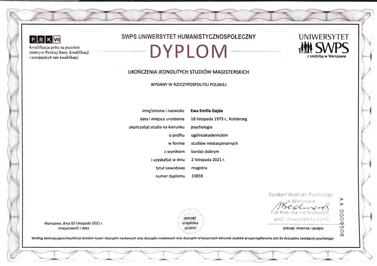 Jestem absolwentką Uniwersytetu SWPS kierunek Psychologia Kliniczna, ukończyłam szkolenie I stopnia w nurcie TSR w Centrum Terapii Skoncentrowanej na Rozwiązaniach (ośrodek szkoleniowy akredytowany przez PSTTSR), II stopień w trakcie realizacji.