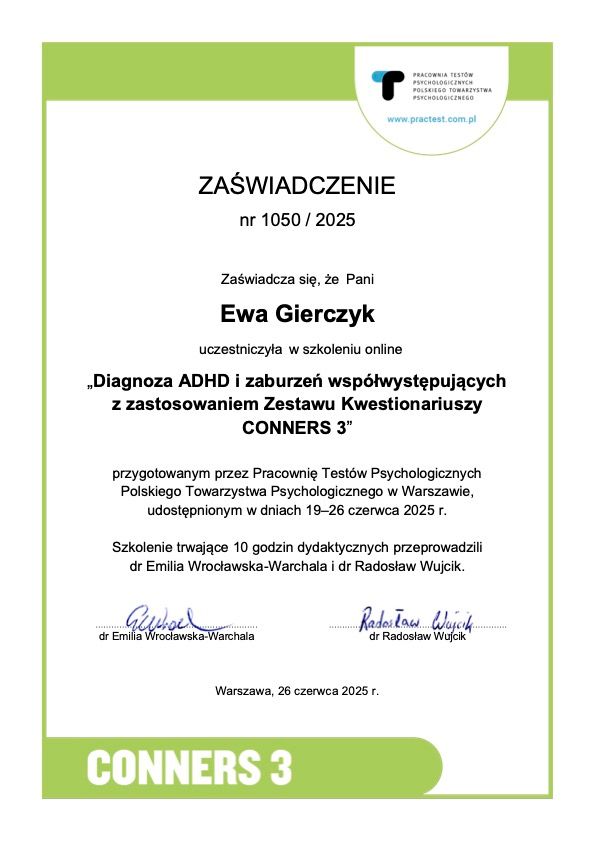 Ukończyłam liczne szkolenia specjalistyczne z diagnozy zaburzeń i trudności rozwojowych dzieci i młodzieży oraz diagnozy osób dorosłych.