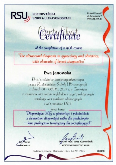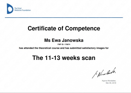 Interesuje się diagnostyką prenatalną. Swoje kwalifikacje podnosi na stażach u światowych ekspertów, m.in. w Berlinie i Londynie. Posiada certyfikaty uprawniające do wykonywania specjalistycznych badań USG: The Fetal Medicine Foundation (FMF) oraz Sekcji Ultrasonografii Polskiego Towarzystwa Ginekologów i Położników. Członkini ISUOG (International Society of Ultrasound in Obstetrics nad Gynecology).