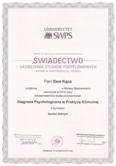 - Studiów podyplomowych Diagnoza psychologiczna w praktyce klinicznej, rekomendowanych przez Polskie Towarzystwo Psychologiczne, a zrealizowanych przez Uniwersytet Humanistyczno-Społeczny SWPS.