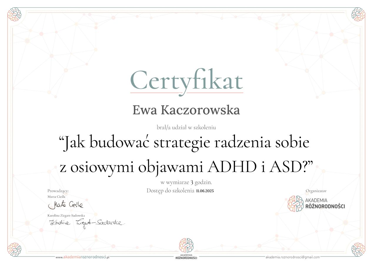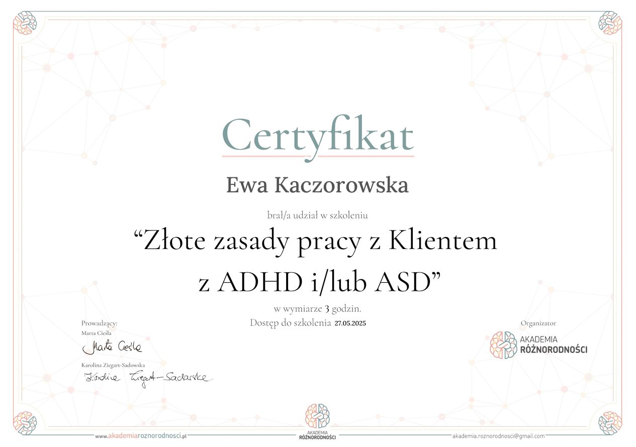 Duża empatia i zrozumienie, można poczuć wparcie i zaopiekowanie. Polecam Panią Ewę, dla osób z ADHD i nie tylko :)