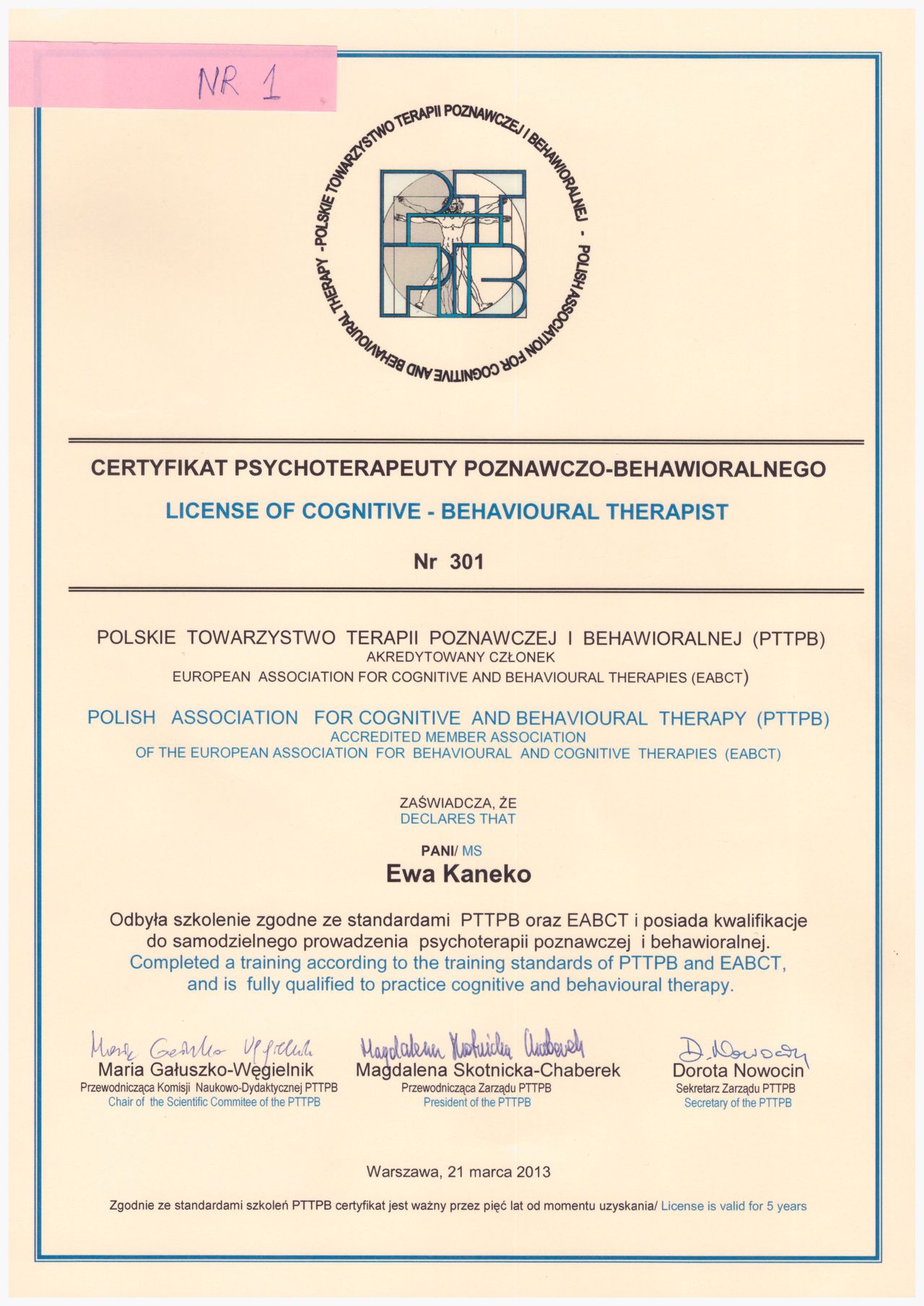 Jestem psycholożką, certyfikowaną psychoterapeutką poznawczo – behawioralną (certyfikat nr 301 PTTPB) oraz psychoterapeutką schematu. Ukończyłam psychologię na Uniwersytecie Jagiellońskim ze specjalizacją kliniczną oraz czteroletnią szkołę psychoterapii poznawczo – behawioralnej prowadzoną przez Oxford Cognitive Therapy Centre i Centrum Terapii Poznawczo – Behawioralnej i od 2012 r. specjalizuję się w Terapii Schematu. Jest członkiem Polskiego Towarzystwa Terapii Poznawczej i Behawioralnej.