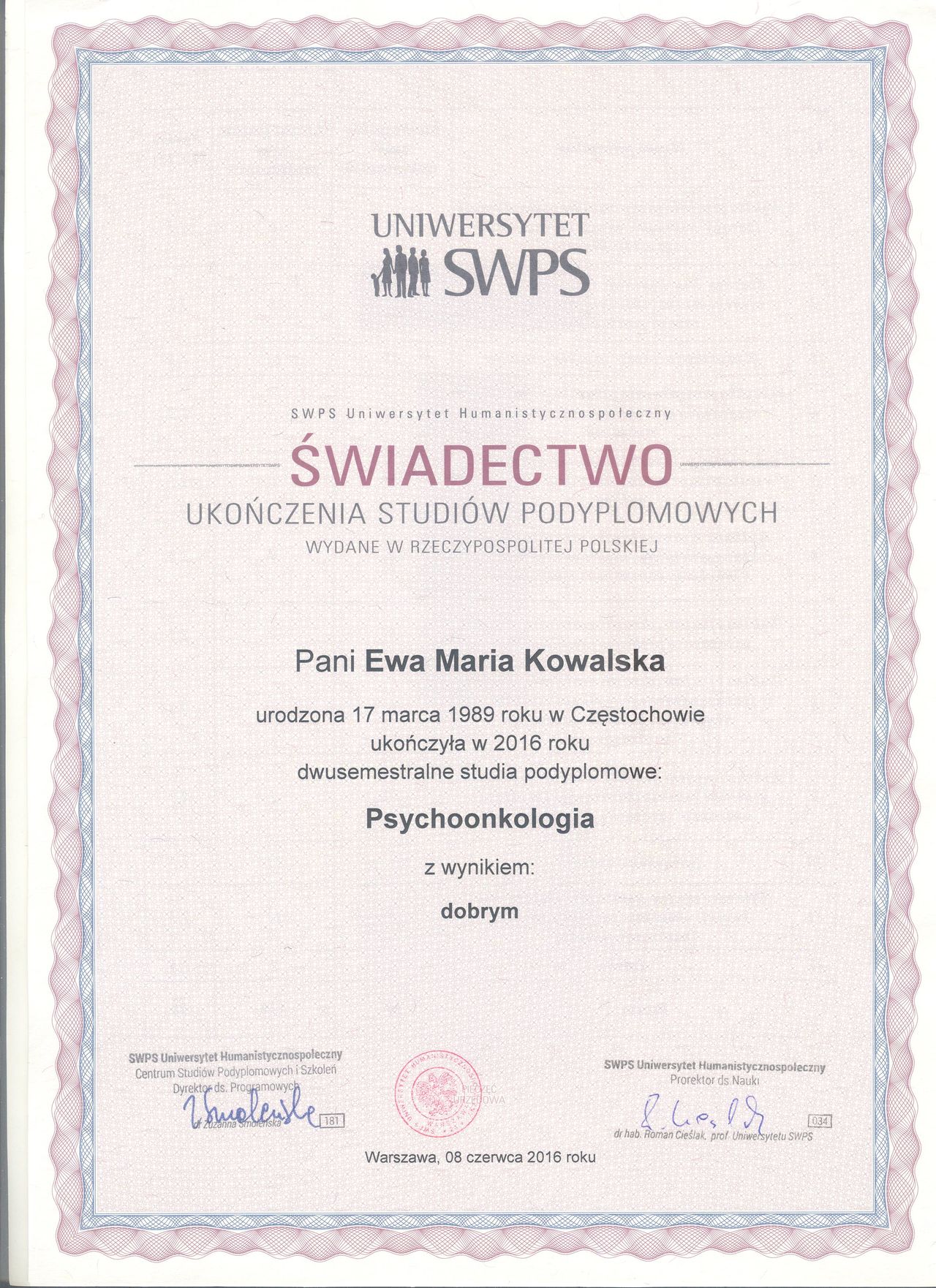 Jestem psychologiem oraz psychoonkologiem. Jestem psychoterapeutką w trakcie 5-letniego szkolenia psychoterapeutycznego w nurcie integracyjnym w Szkole Psychoterapii Vis Salutis. Należę do Polskiego Towarzystwa Psychiatrycznego i Polskiego Towarzystwa Psychoonkologicznego. Doświadczenie zawodowe zdobywałam pracując na oddziałach szpitalnych z dziećmi, młodzieżą oraz dorosłymi – dzięki temu potrafię z uważnością spojrzeć na różne aspekty zdrowia psychicznego w różnych etapach życia. Pomagam osobom dorosłym oraz starszej młodzieży (od 16. roku życia), zwłaszcza tym, którzy doświadczają lęku, depresji, problemów w relacjach, przeżywają kryzysy życiowe lub zmagają się z chorobą nowotworową. W swojej pracy stawiam na empatię, zaangażowanie oraz indywidualne podejście. Najważniejsze jest dla mnie stworzenie bezpiecznej przestrzeni, w której możesz szczerze opowiedzieć o trudnościach i wspólnie poszukać rozwiązań.