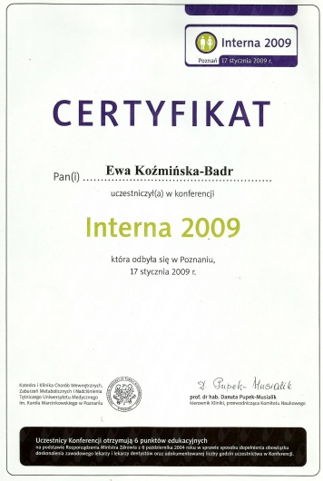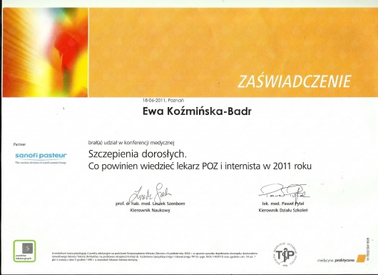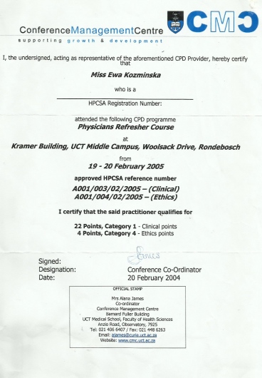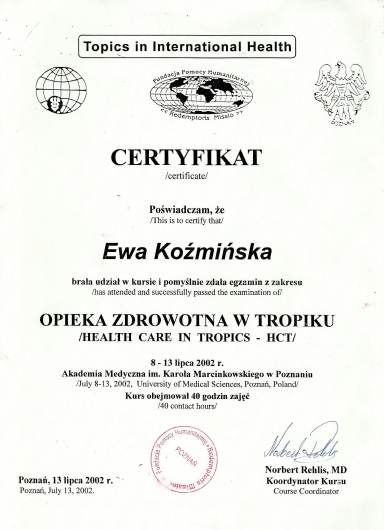 Moving & Assisting Course (2005, Glasgow), Optical Awareness Training (2005, Glasgow) Diploma in Health Care in the Tropics (2002, Poznan, Poland), Basic Life Support i wiele innych