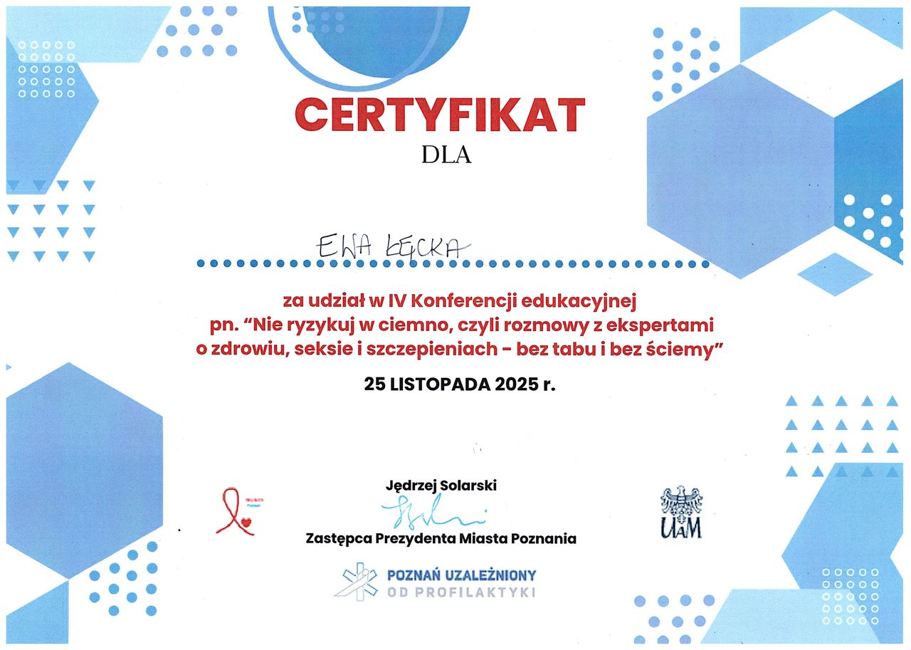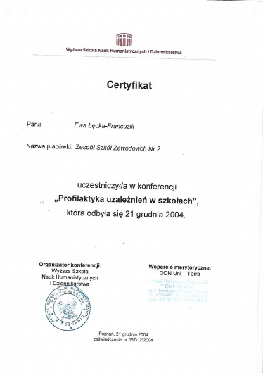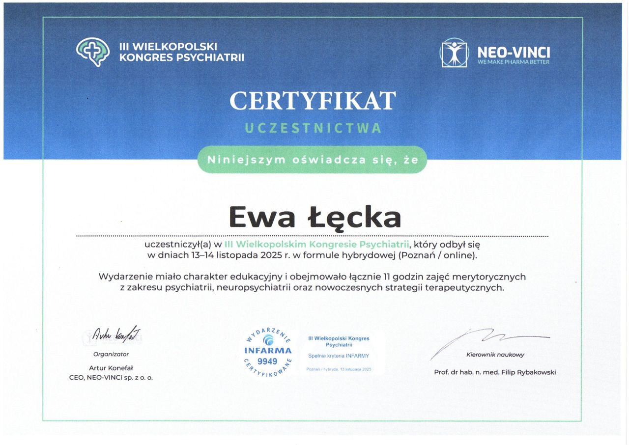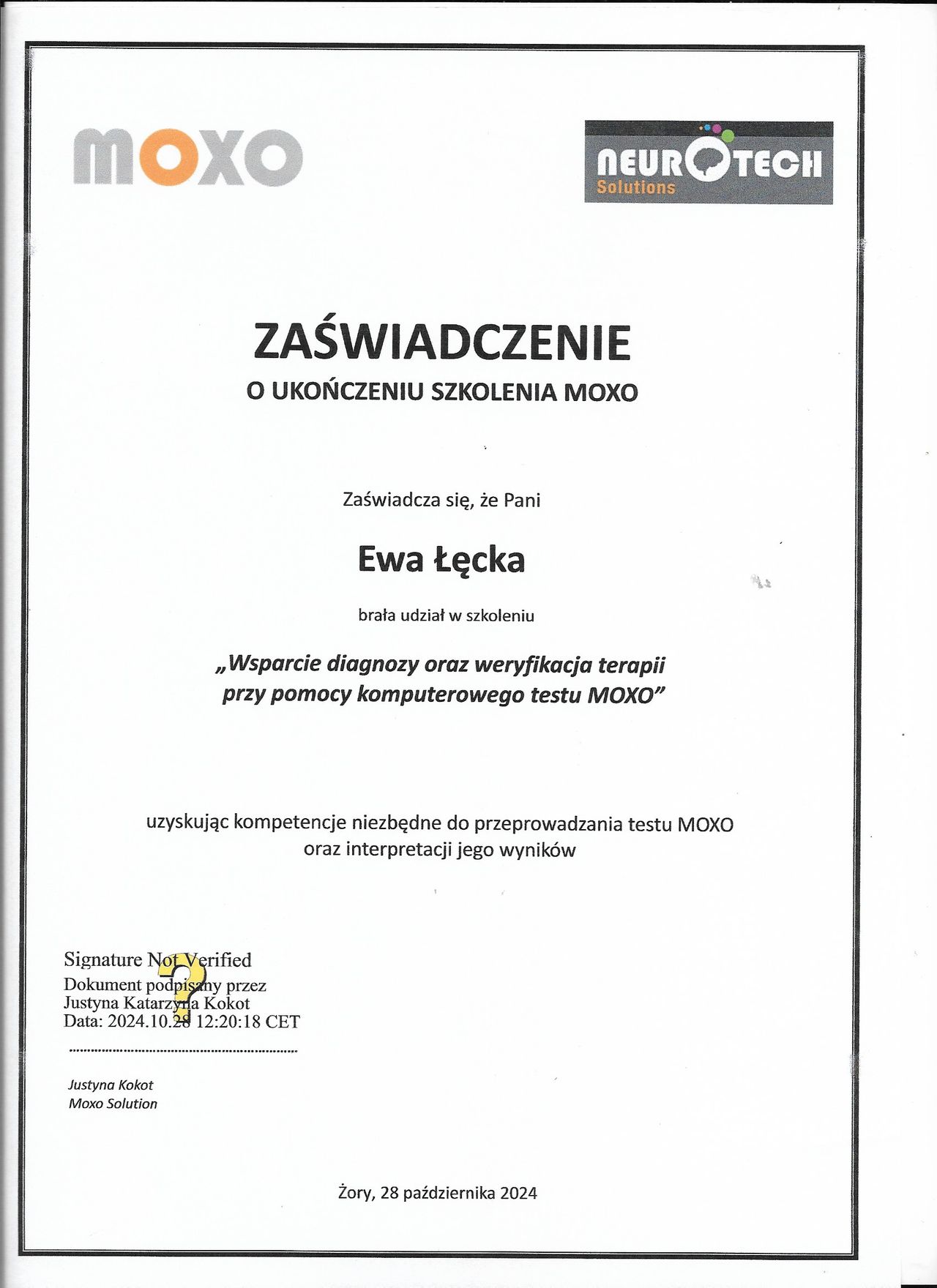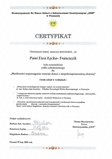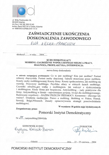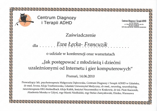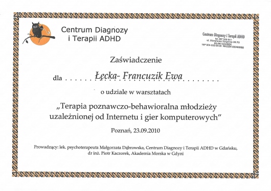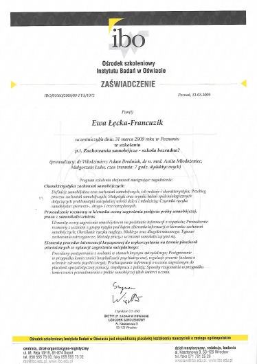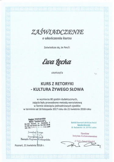 Jestem absolwentką Psychologii UAM (specjalizacja wychowawcza i kliniczna). Ponadto skończyłam Studia Podyplomowe z Pedagogiki. Uczestniczyłam w Kursie Psychoterapii Systemowej. Skończyłam studia podyplomowe z Logopedii.