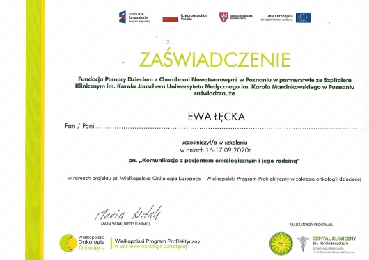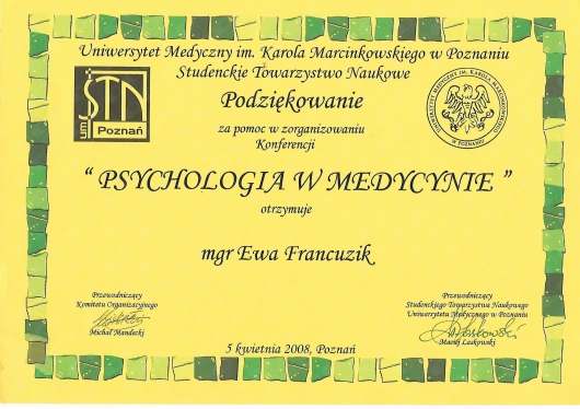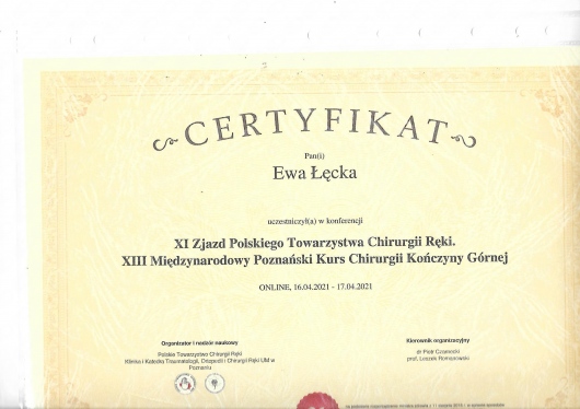 Działam naukowo - brałam aktywny udział w wielu kursach, konferencjach międzynarodowych - ostatnio w XI Zjedzie Polskiego Towarzystwa Chirurgii Ręki (16-17.04.2021), gdzie dzieliłam się swoimi doświadczeniami na temat opieki psychologicznej nad dziećmi z wadami wrodzonymi: "Psychological care for a family with a child with a congenital defect ".