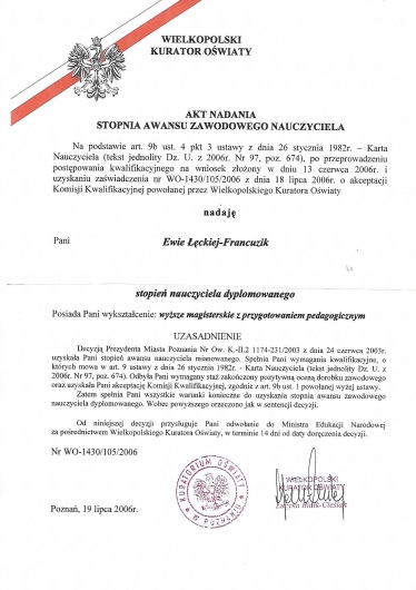 Pracuję w oświacie z dziećmi i młodzieżą ze specjalnymi potrzebami edukacyjnymi, w awansie zawodowym uzyskałam jako psycholog stopień nauczyciela dyplomowanego. Prowadzę zajęcia socjoterapii, rewalidacji poszerzające kompetencje społeczno-emocjonalne - współpracuję z Zespołem Szkół Zawodowych nr 2 w Poznaniu oraz z Liceum Ogólnokształcącym w ZSS nr 111 w Poznaniu. Mój zawód, moja praca jest moją pasją. Moja aktywność zawodowa wykracza poza godziny pracy zawodowej, dlatego wolny czas spędzam z dziećmi i młodzieżą organizując turnusy rehabilitacyjne dla dzieci i młodzieży ze specjalnymi potrzebami edukacyjnymi (niepełnosprawności: ruchowa, neurologiczna, umysłowa). Współpracuję z Wielkopolskim Oddziałem Sekcji Olimpiad Specjalnych.