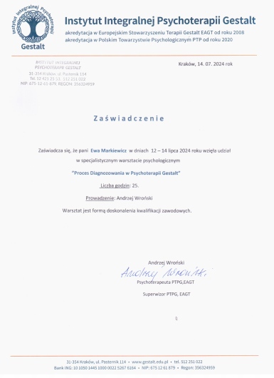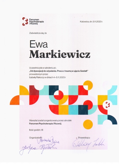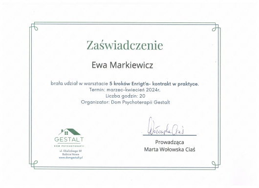 Nazywam się Ewa Markiewicz. Jestem psychoterapeutką Gestalt (w trakcie całościowego szkolenia w Instytucie Gestalt w Krakowie akredytowanego przez Europejskie Stowarzyszenie Psychoterapii Gestalt EAGT, Europejskie Stowarzyszenie Psychoterapii EAP).