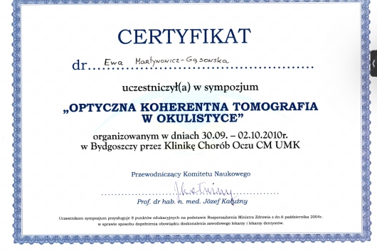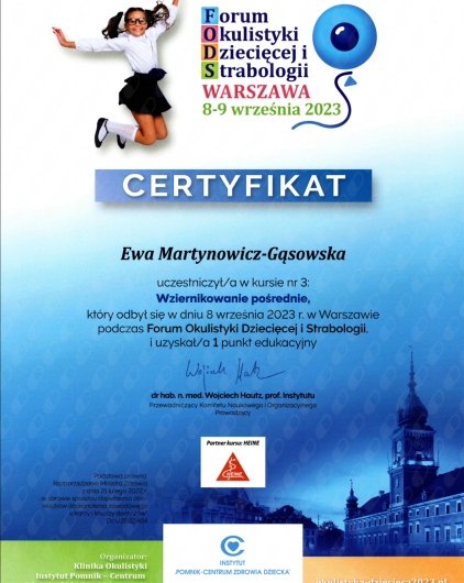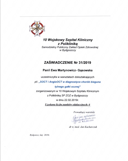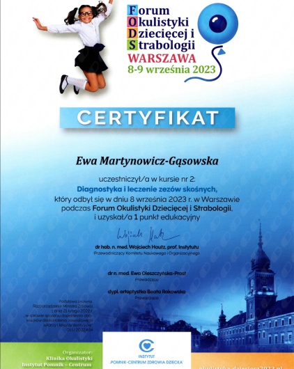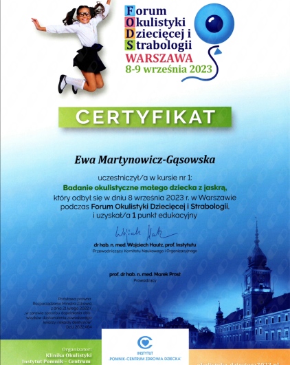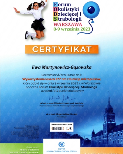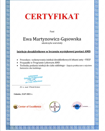 Doświadczenie zawodowe zdobyłam pracując również w poradniach okulistycznych: Nadmorskiego Centrum Medycznego i Polmedu. W Profesorskim Centrum Okulistycznym miałam możliwość prowadzenia programów lekowych. Obecnie pracuję w Poradni Leczenia Zeza i Niedowidzenia oraz na Oddziale Okulistycznym dla Dzieci, gdzie zdobyłam wiedzę i praktyczne umiejętności w zakresie diagnostyki, korekcji wad wzroku oraz leczenia niedowidzenia i choroby zezowej. Przeprowadzam zabiegi operacyjne zeza. Zajmuję się także diagnostyką i leczeniem retinopatii wcześniaczej, wykonując zabiegi laseroterapii siatkówki i iniekcji doszklistkowych.