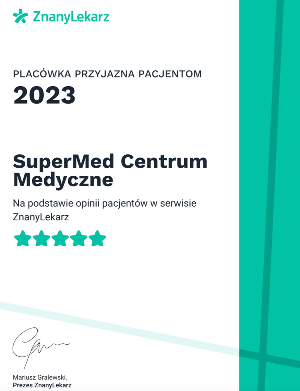 Administratorem danych osobowych jest ZnanyLekarz sp. z o.o. z siedzibą w Warszawie przy ul. Kolejowej 5/7. Informujemy, że po przekazaniu przez nas Twoich danych osobowych wybranemu przez Ciebie Profesjonaliście, staje się on również administratorem Twoich danych osobowych i przetwarza je w celach związanych ze świadczeniem usług medycznych lub innych podobnych.
