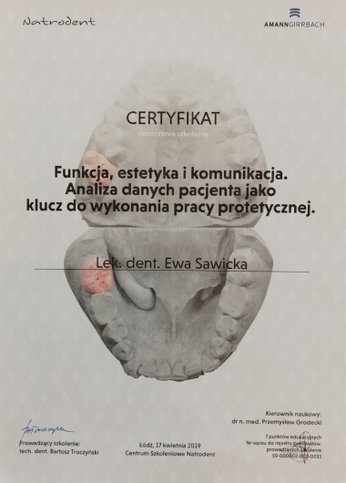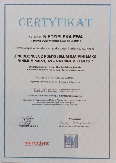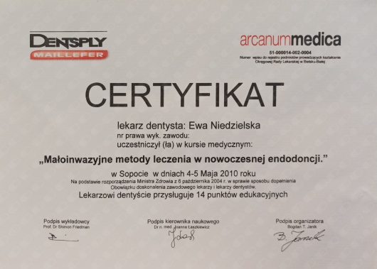 Pani doktor bardzo miła, szczegółowo wyjaśnia problem, podaje plan leczenia uwzględniając różne jego warianty. Ponowne leczenie kanałowe mojego zęba z niełatwym usunieciem metalowego wkładu przebiegło bardzo sprawnie. Dopiero rozpoczęłam leczenie, ale podejście Pani doktor bardzo mnie zachęciło do kontynuowania leczenia właśnie u Niej.