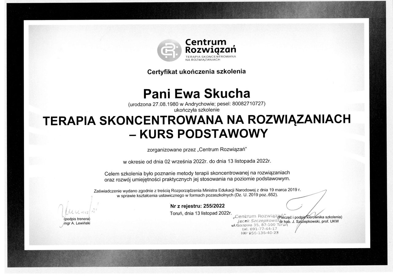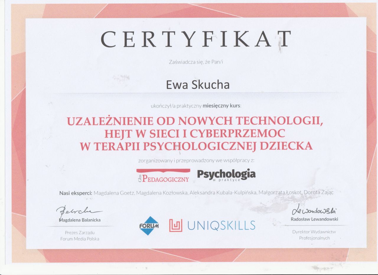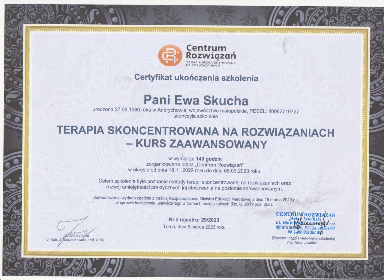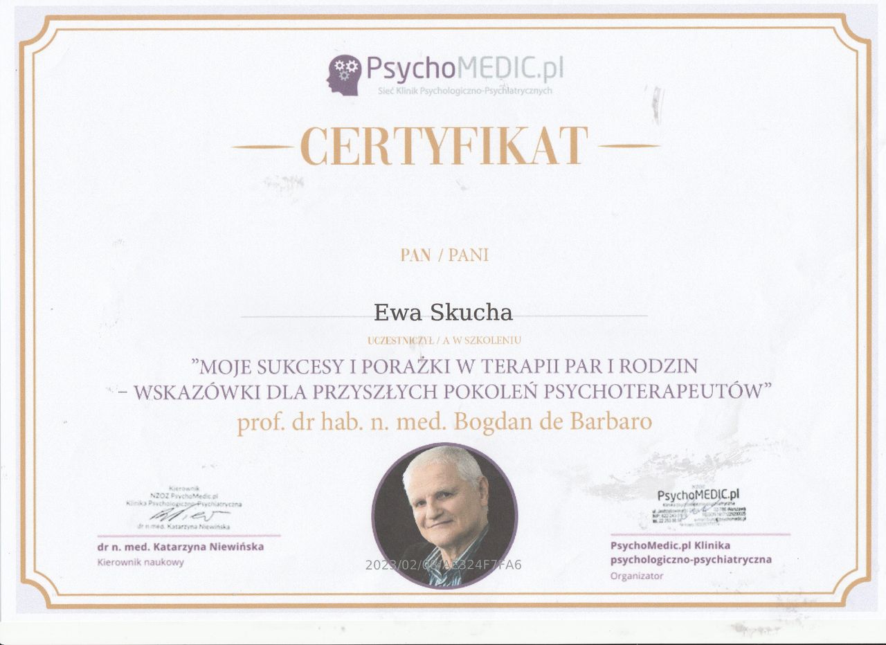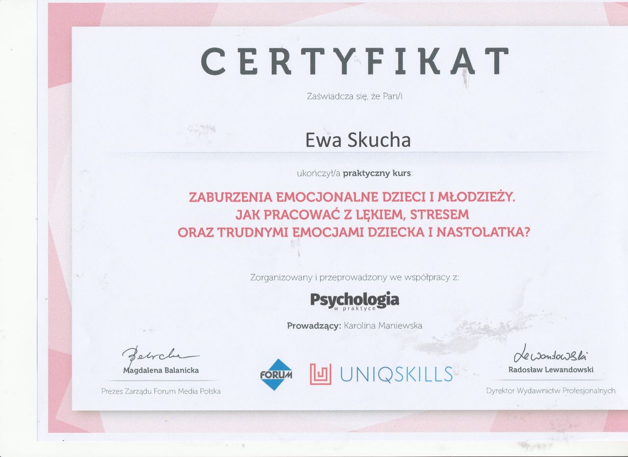 Nazywam się Ewa Skucha. Jestem psychologiem i psychoterapeutą w trakcie procesu certyfikacji. Ukończyłam studia magisterskie na kierunku psychologia, moim drugim posiadanym kierunkiem jest pielęgniarstwo, które pomaga mi w lepszym rozumieniu i pomaganiu drugiemu człowiekowi.