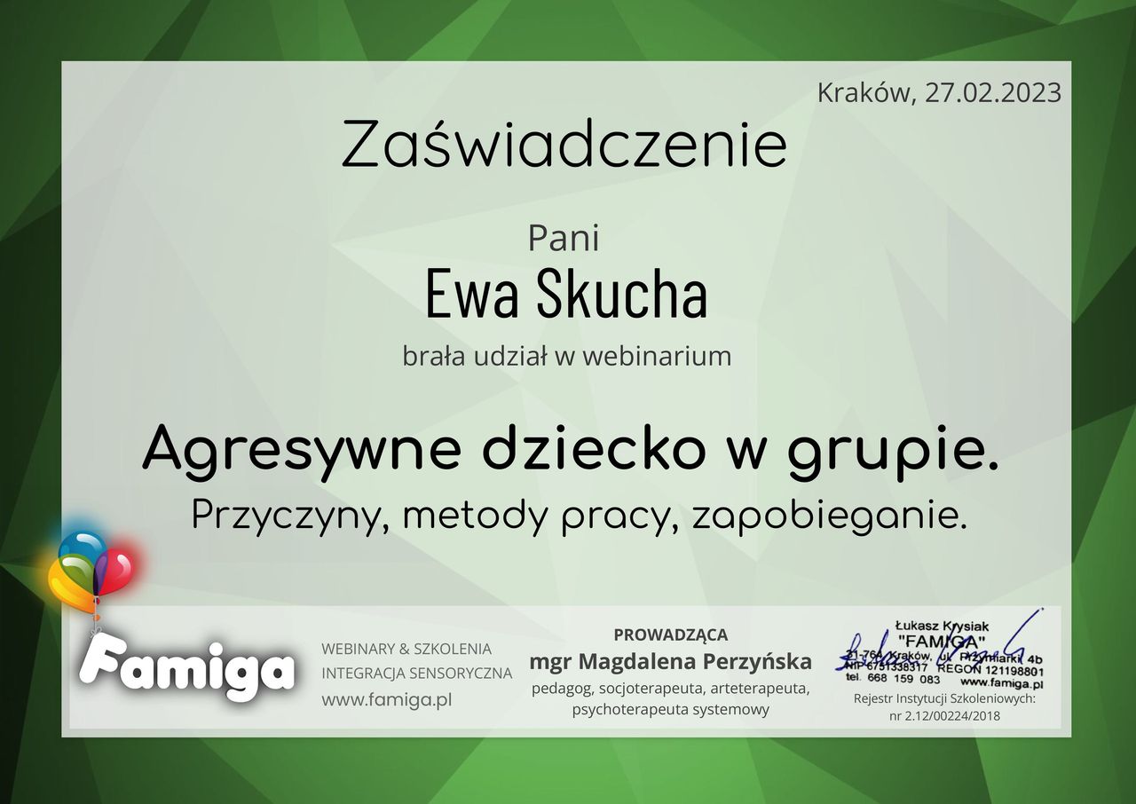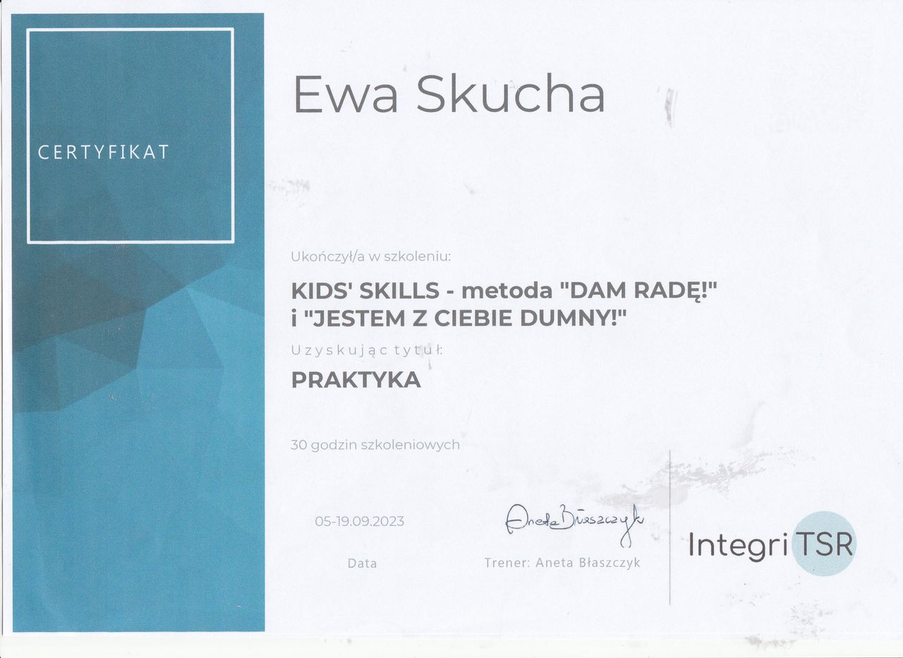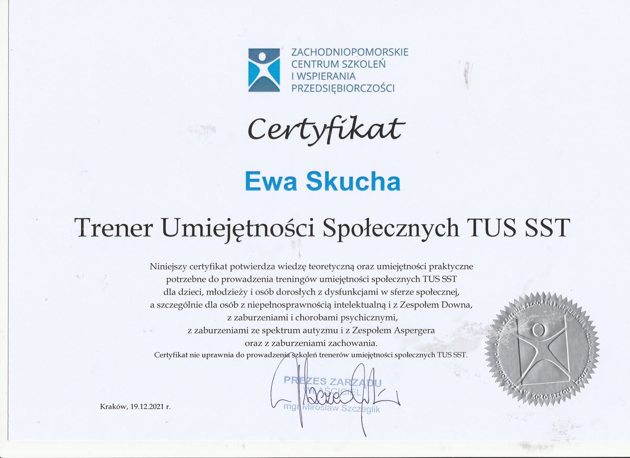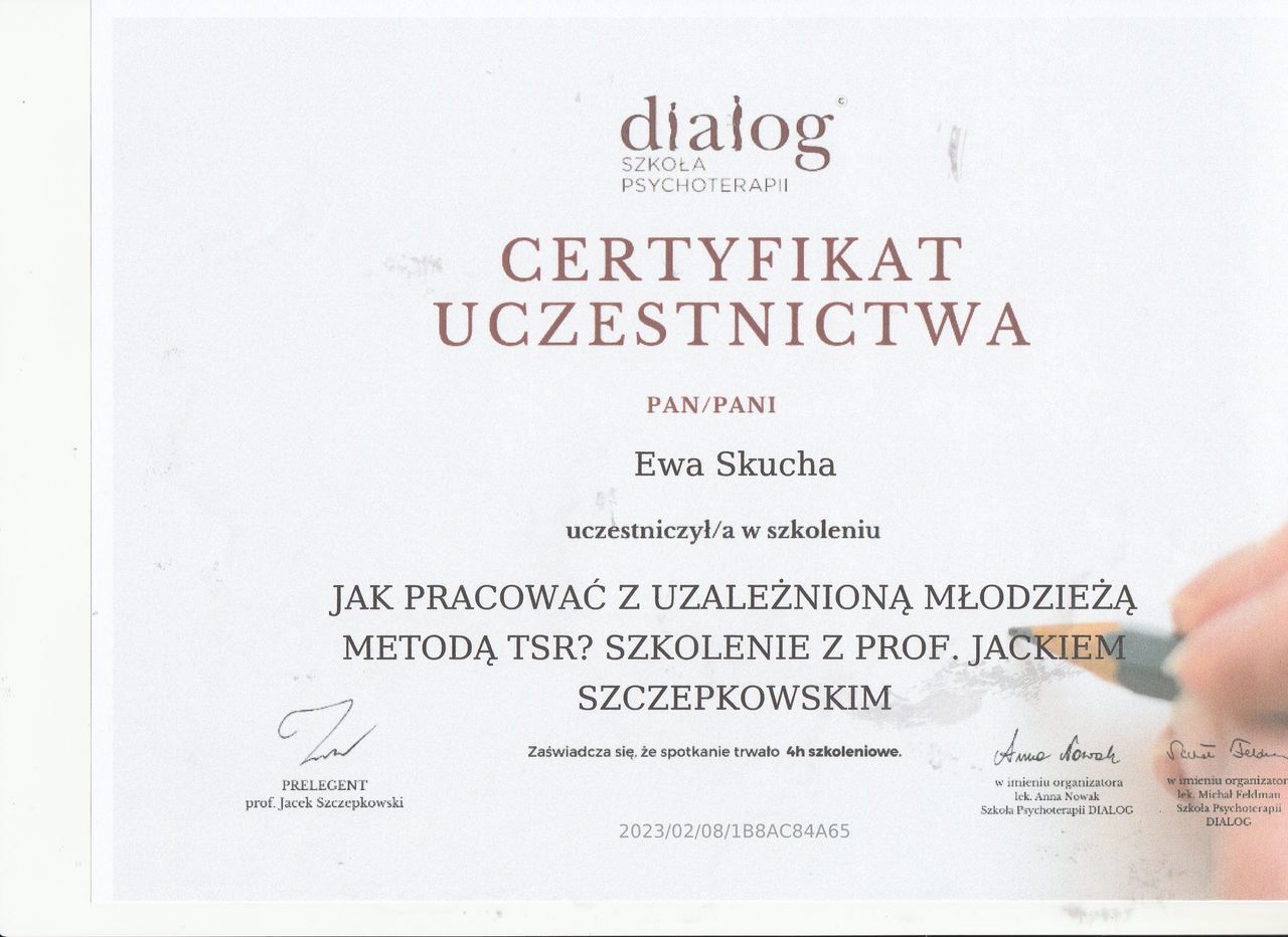 Nazywam się Ewa Skucha. Jestem psychologiem i psychoterapeutą w trakcie procesu certyfikacji. Ukończyłam studia magisterskie na kierunku psychologia, moim drugim posiadanym kierunkiem jest pielęgniarstwo, które pomaga mi w lepszym rozumieniu i pomaganiu drugiemu człowiekowi.