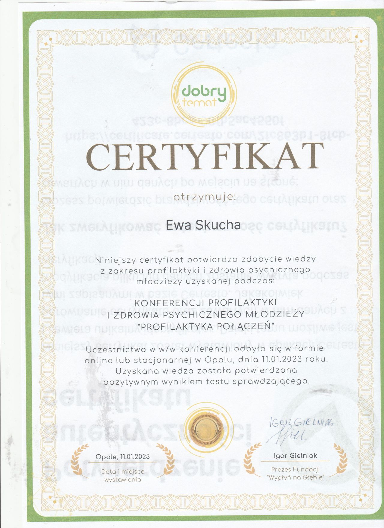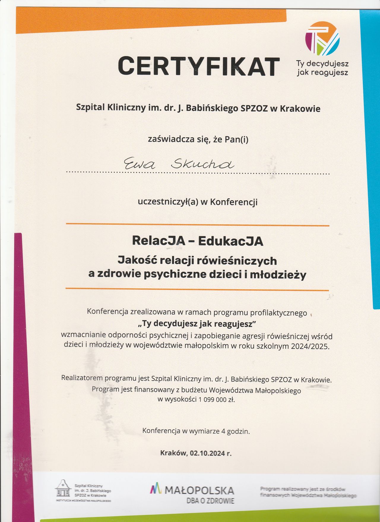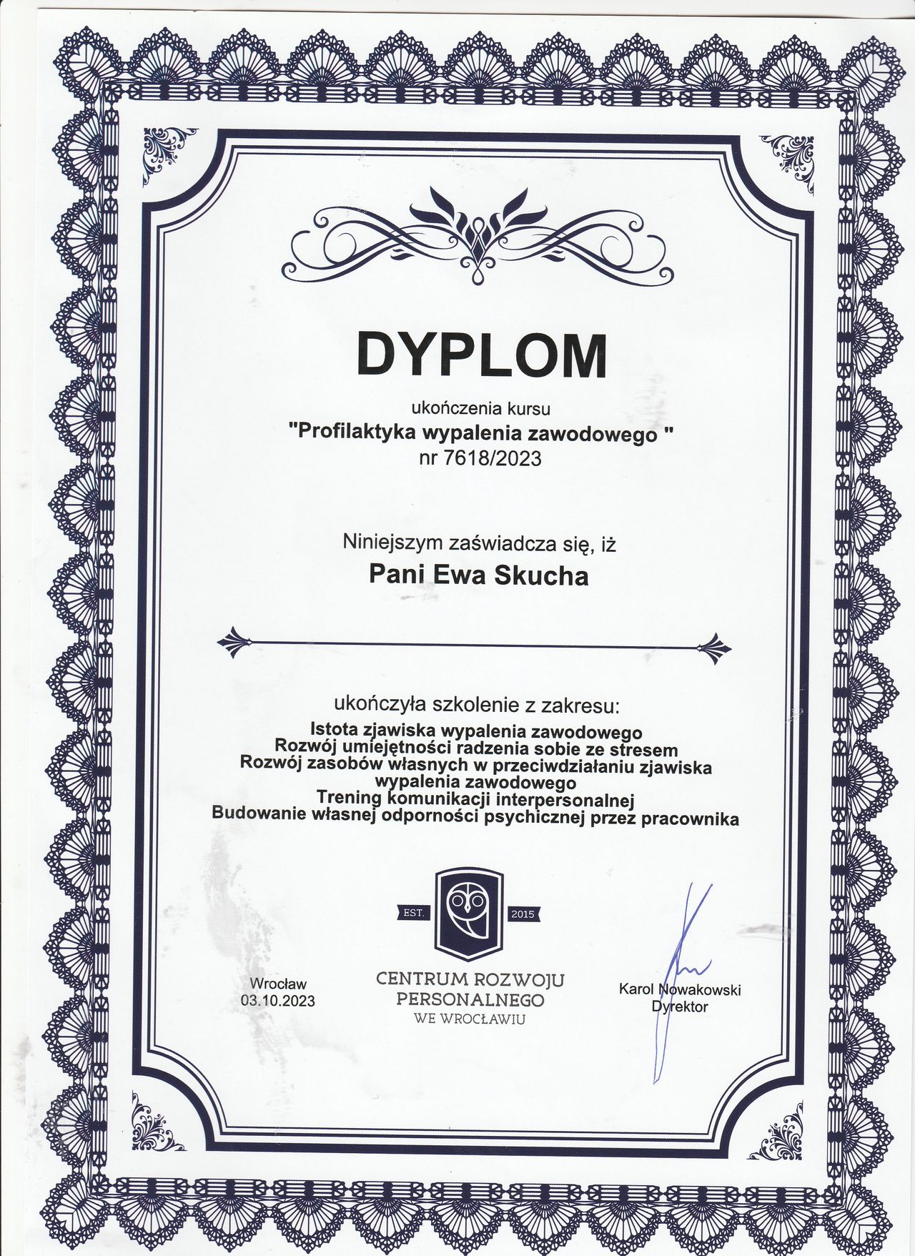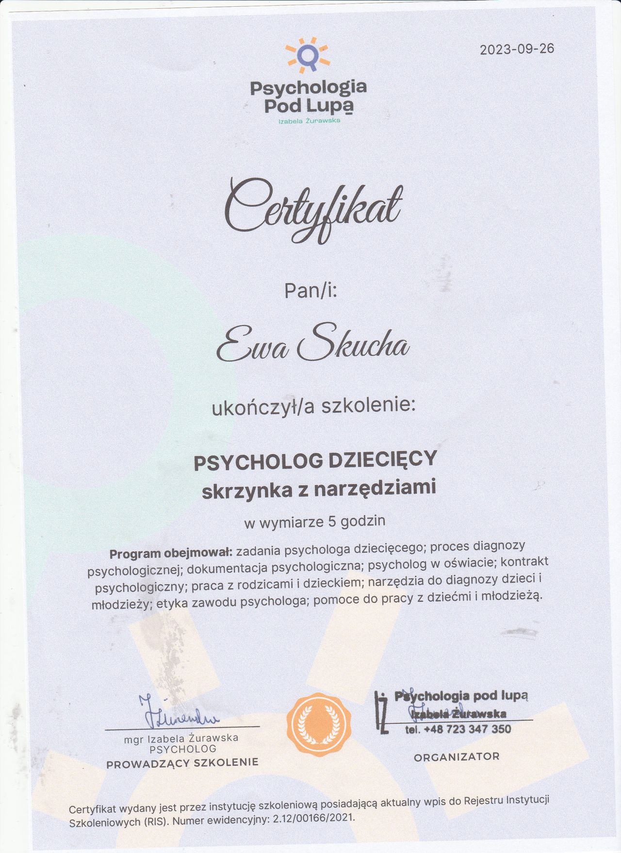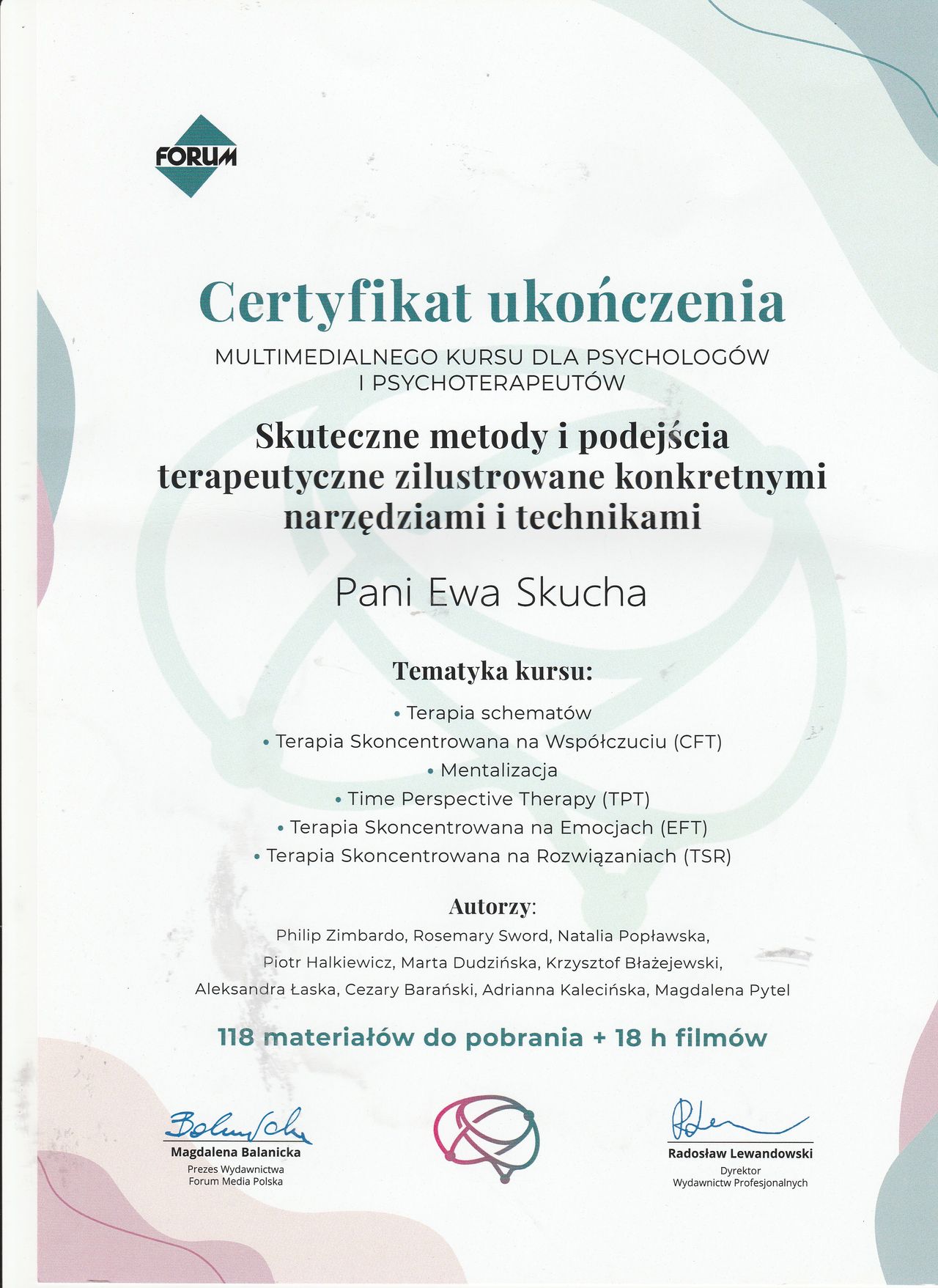 Nazywam się Ewa Skucha. Jestem psychologiem i psychoterapeutą w trakcie procesu certyfikacji. Ukończyłam studia magisterskie na kierunku psychologia, moim drugim posiadanym kierunkiem jest pielęgniarstwo, które pomaga mi w lepszym rozumieniu i pomaganiu drugiemu człowiekowi.