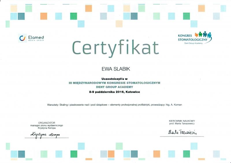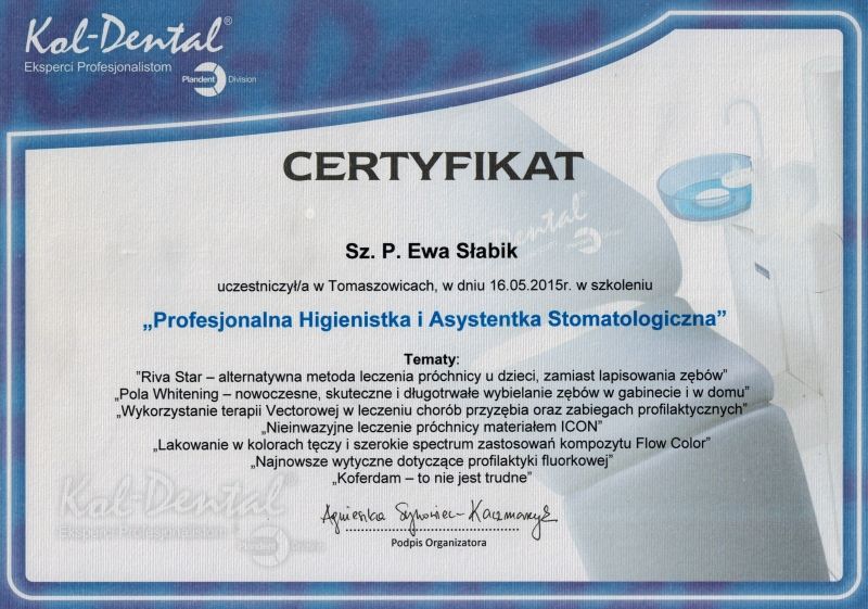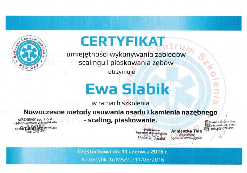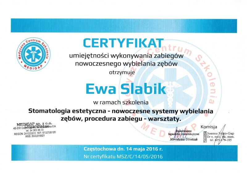 Jaki jest zakres porad oferowanych przez Ewa Slabik?Ewa Slabik to higienistka/higienista stomatologiczny. Na podstawie swojego doświadczenia i wykształcenia Ewa Slabik oferuje usługi takie jak: higienizacja, Wybielanie zębów, piaskowanie, usuwanie kamienia nazębnego, nakładkowe wybielanie zębów, wybielanie gabinetowe, higienizacja + wybielanie, Konsultacja higienistki, Guided Biofilm Therapy, pakiet higienizacyjny z instruktażem.