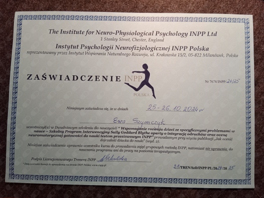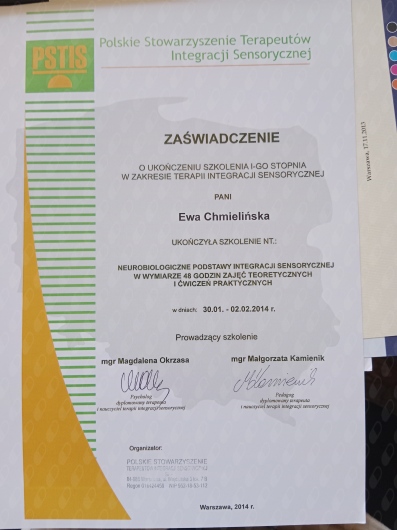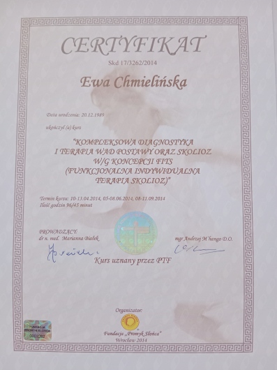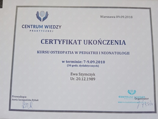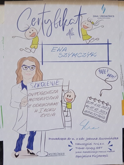 Jestem absolwentką Warszawskiego Uniwersytetu Medycznego na kierunku fizjoterapia. Swoje doświadczenie zdobywałam w Mazowieckim Centrum Neuropsychiatrii pracując na oddziale neurologicznym oraz oddziale wieku rozwojowego, gdzie prowadziłam terapię dzieci z mózgowym porażeniem dziecięcym , zespołami genetycznymi oraz niemowlętami. Obecnie pracuję w szkole specjalnej, jako specjalista fizjoterapii, w Centrum Medycznym Polskiego Związku Gluchych oraz w gabinecie Fizjo-pediatria gdzie swoja wiedzą i doświadczeniem wspieram rozwój niemowląt. Bardzo ważnym aspektem mojej pracy jest dla mnie relacja z rodzicami moich pacjentów, ponieważ spokojny i zaopiekowany rodzic to klucz do sukcesu terapii dziecka Ukończone kursy: PIMT- terapia manualna, Regulacja Autonomicznego układu nerwowego ,NDT-Bobath NDT-Bobath Baby Fits - terapia skolioz Zoga w terapii niemowląt Kontakt wzrokowy z rozwojem psychomotorycznym w 1 roku życia Ontogeneza motoryczna z odruchami w pierwszym roku życia Kurs Osteopatia w pediatrii i neonatologii Terapia Integracji Sensorycznej - I stopień Kinesiology taping Kurs INPP- intergracja odruchów oraz ocena neuromotorycznej gotowości do nauki testem przesiewowym wg Sally Goddard Blythe Zapraszam