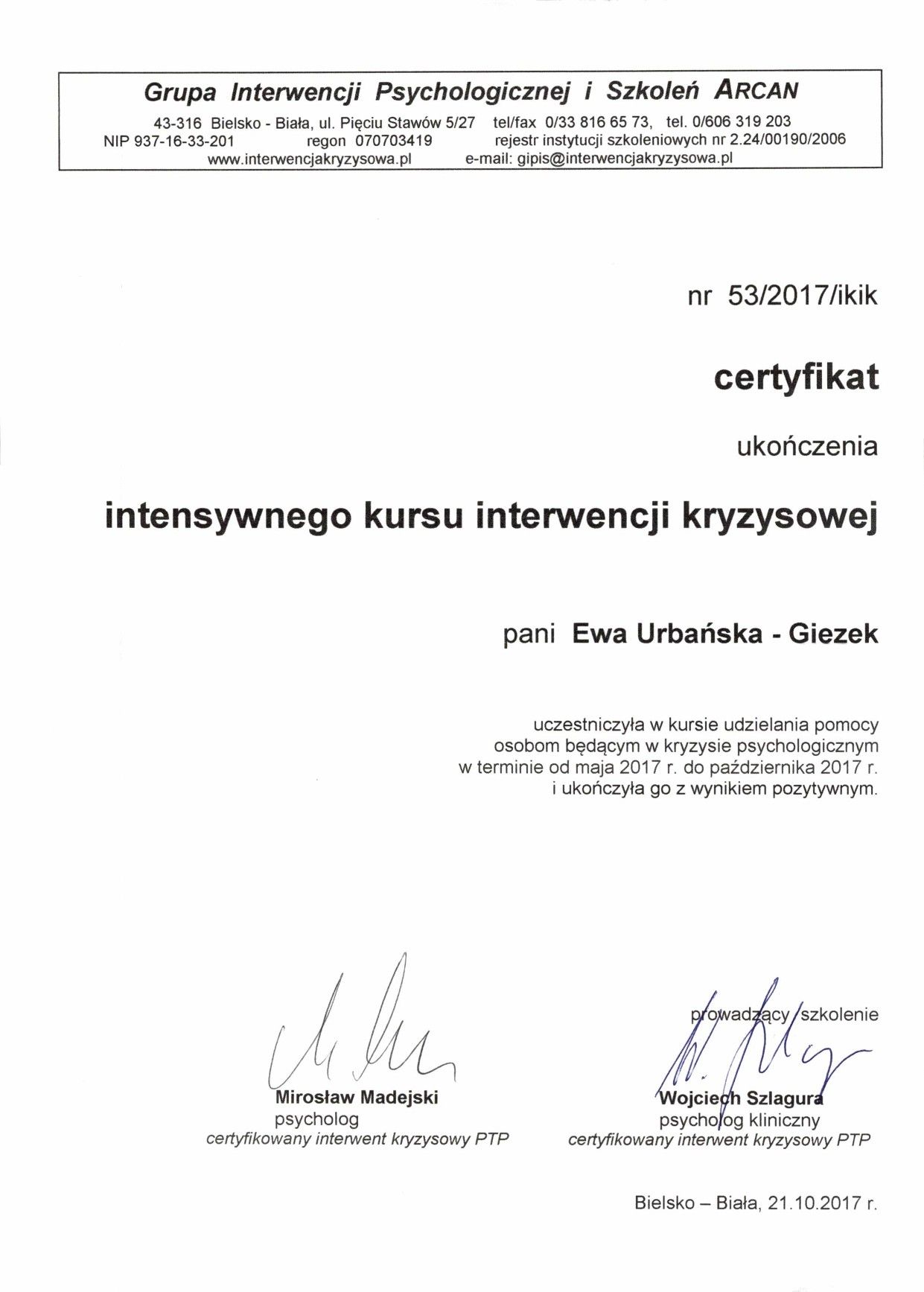 W trakcie mojej pracy uczestniczyłam w licznych warsztatach z zakresu diagnozy psychologicznej, oraz psychoterapii Gestalt.
