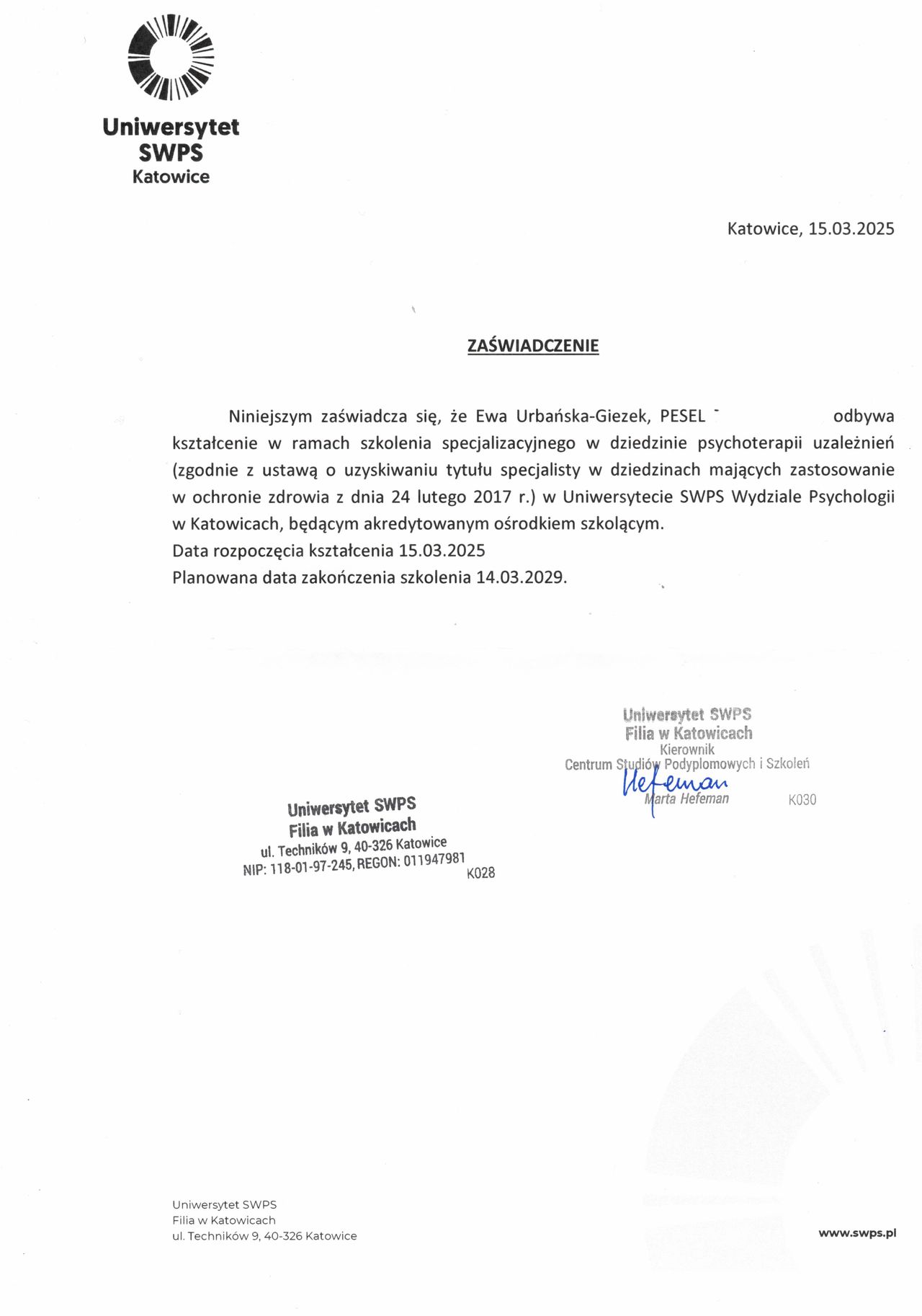 Jestem psychologiem, w trakcie specjalizacji w dziedzinie psychoterapii uzależnień.