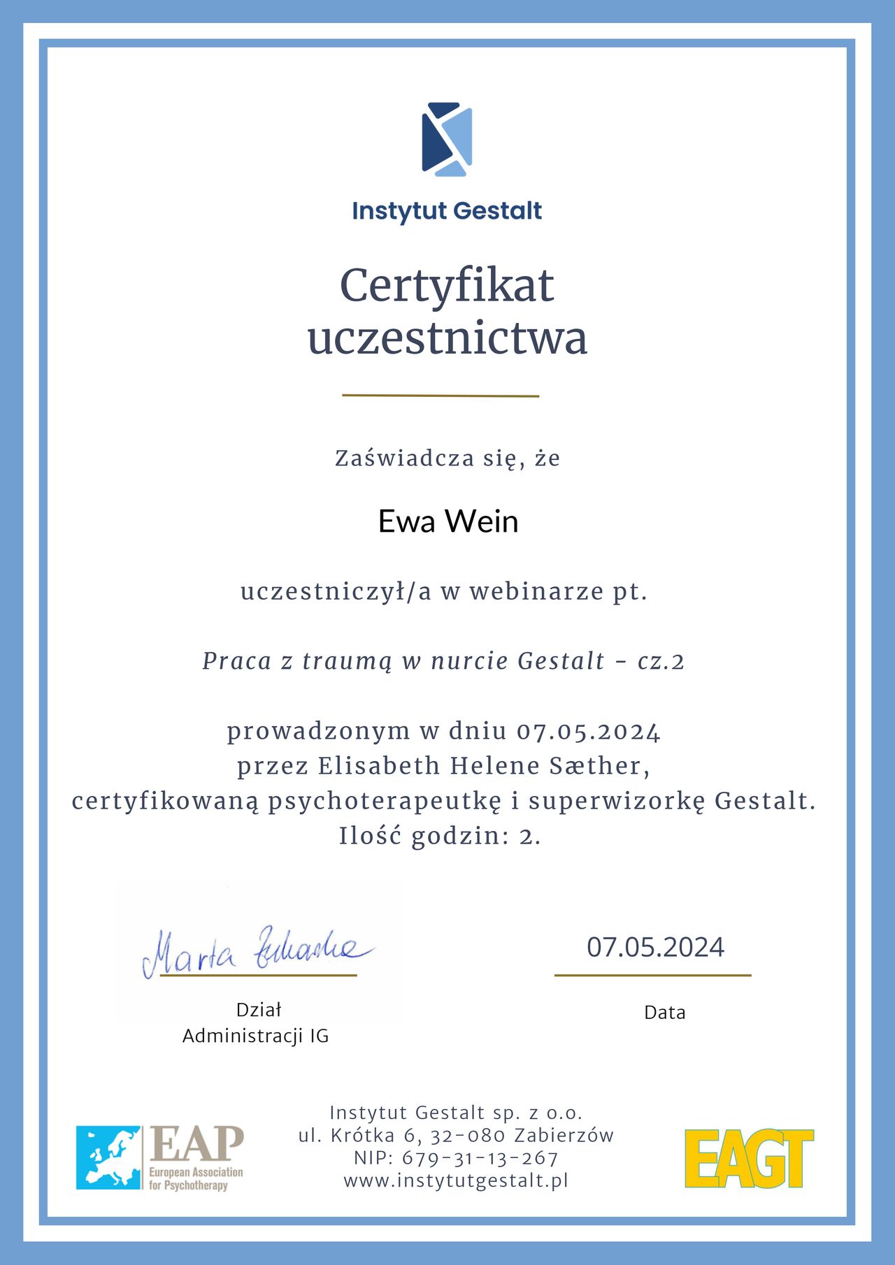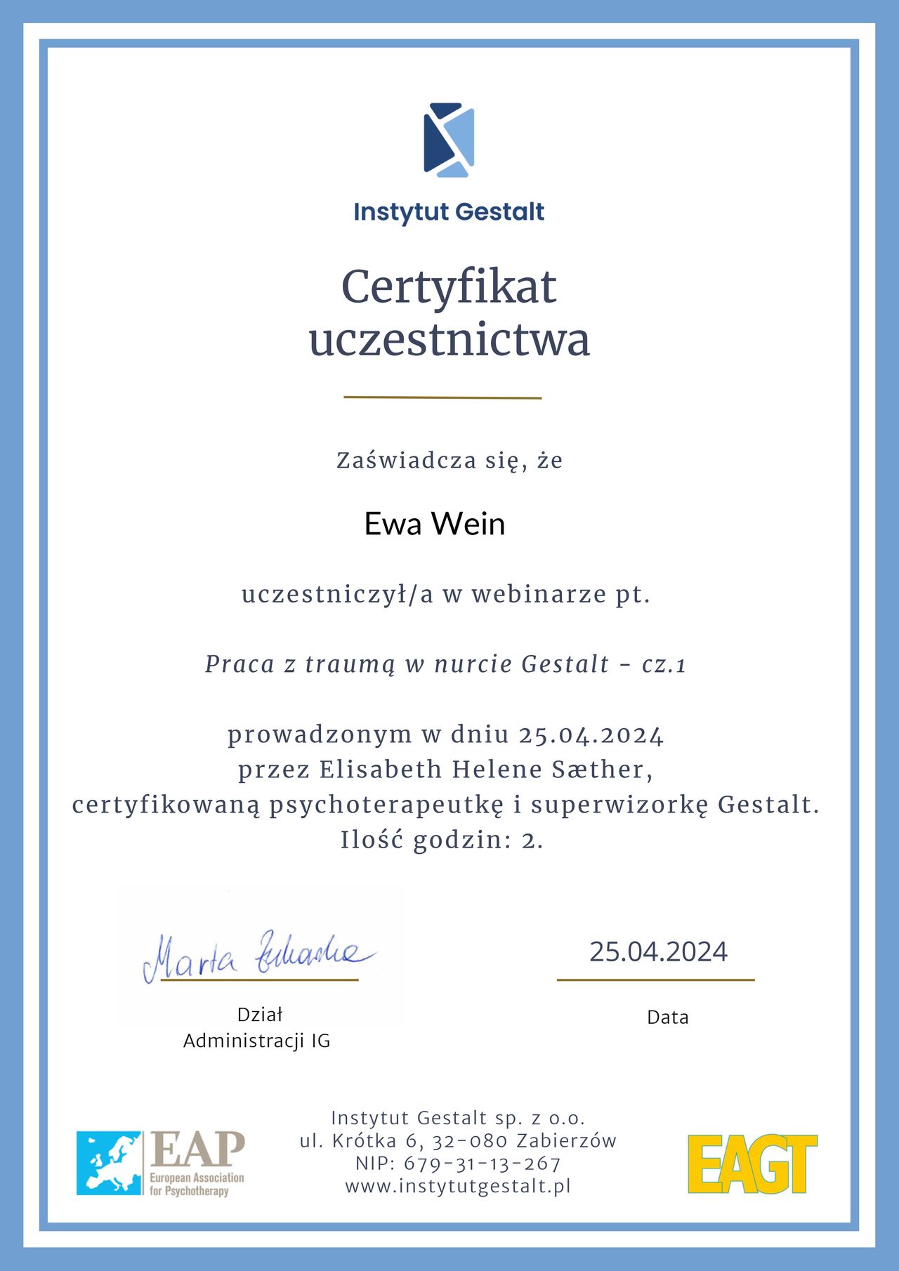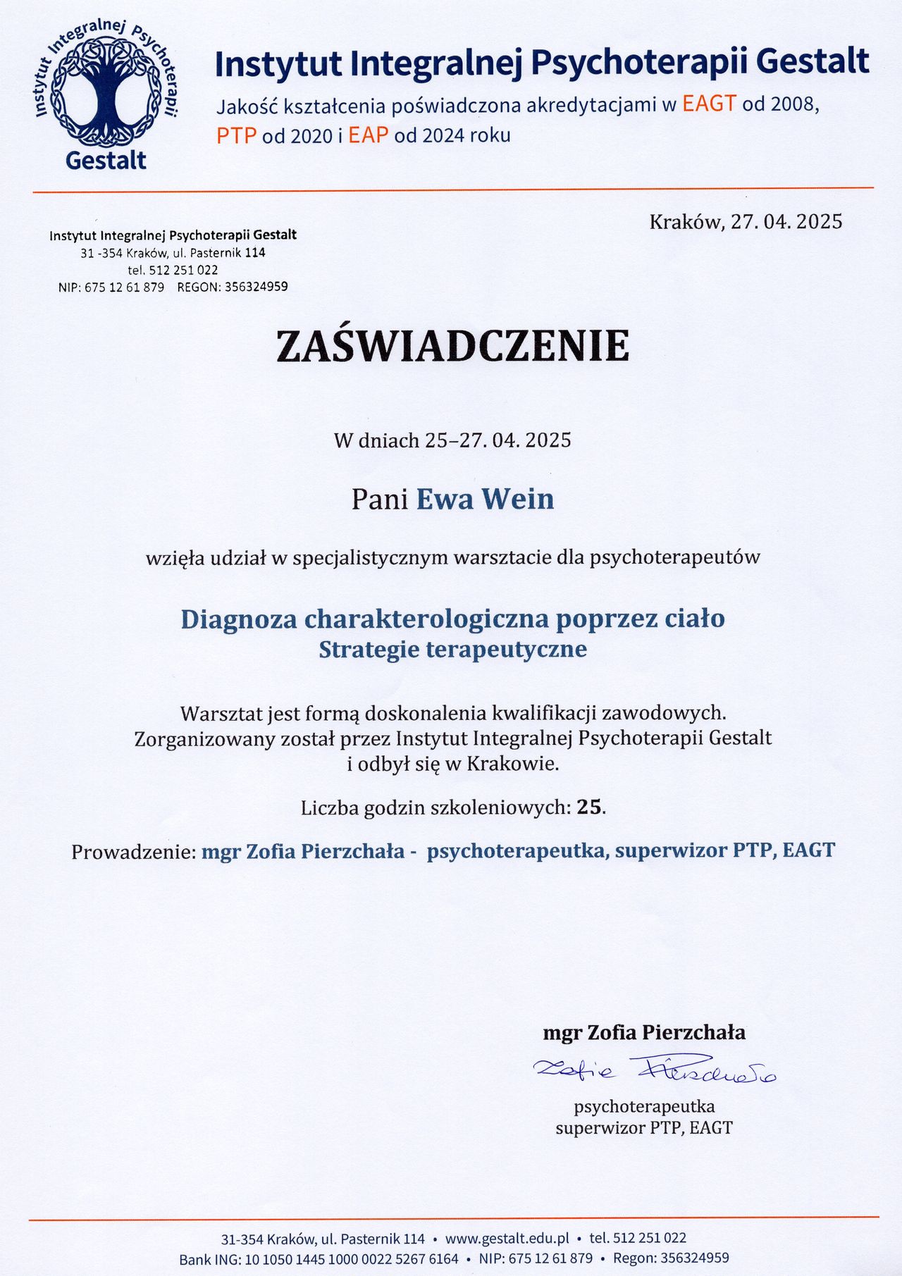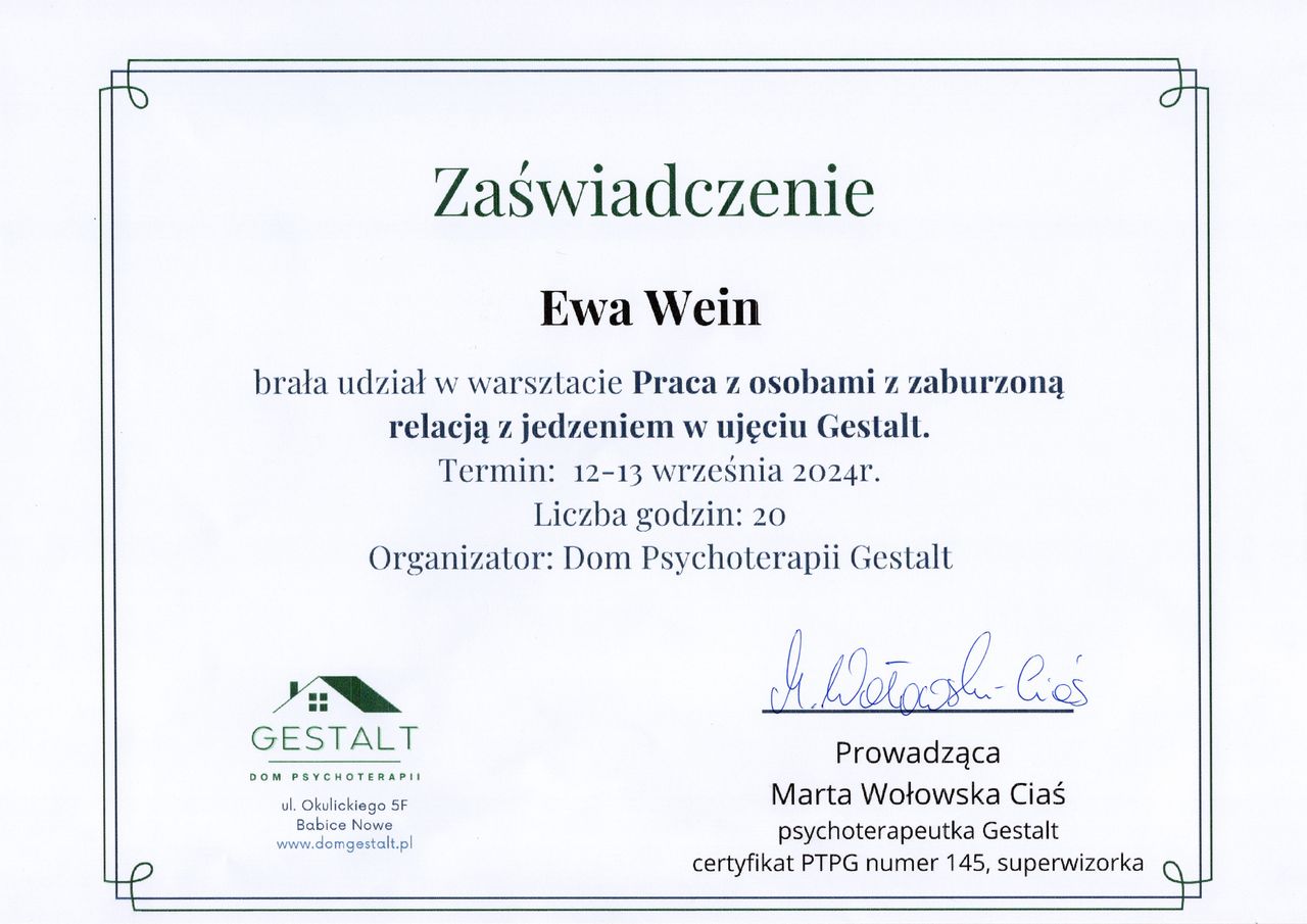 • Ewa Wein Psychoterapia Gestalt • konsultacja psychoterapeutyczna (pierwsza wizyta) •