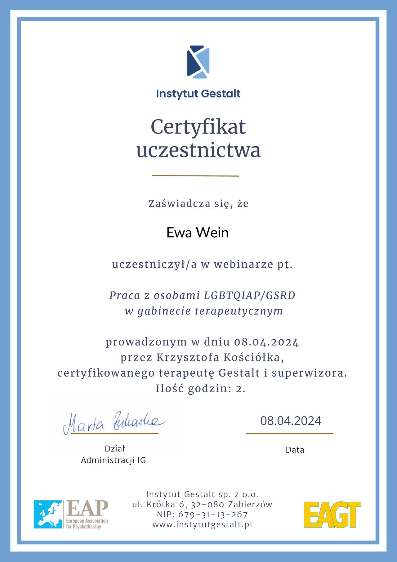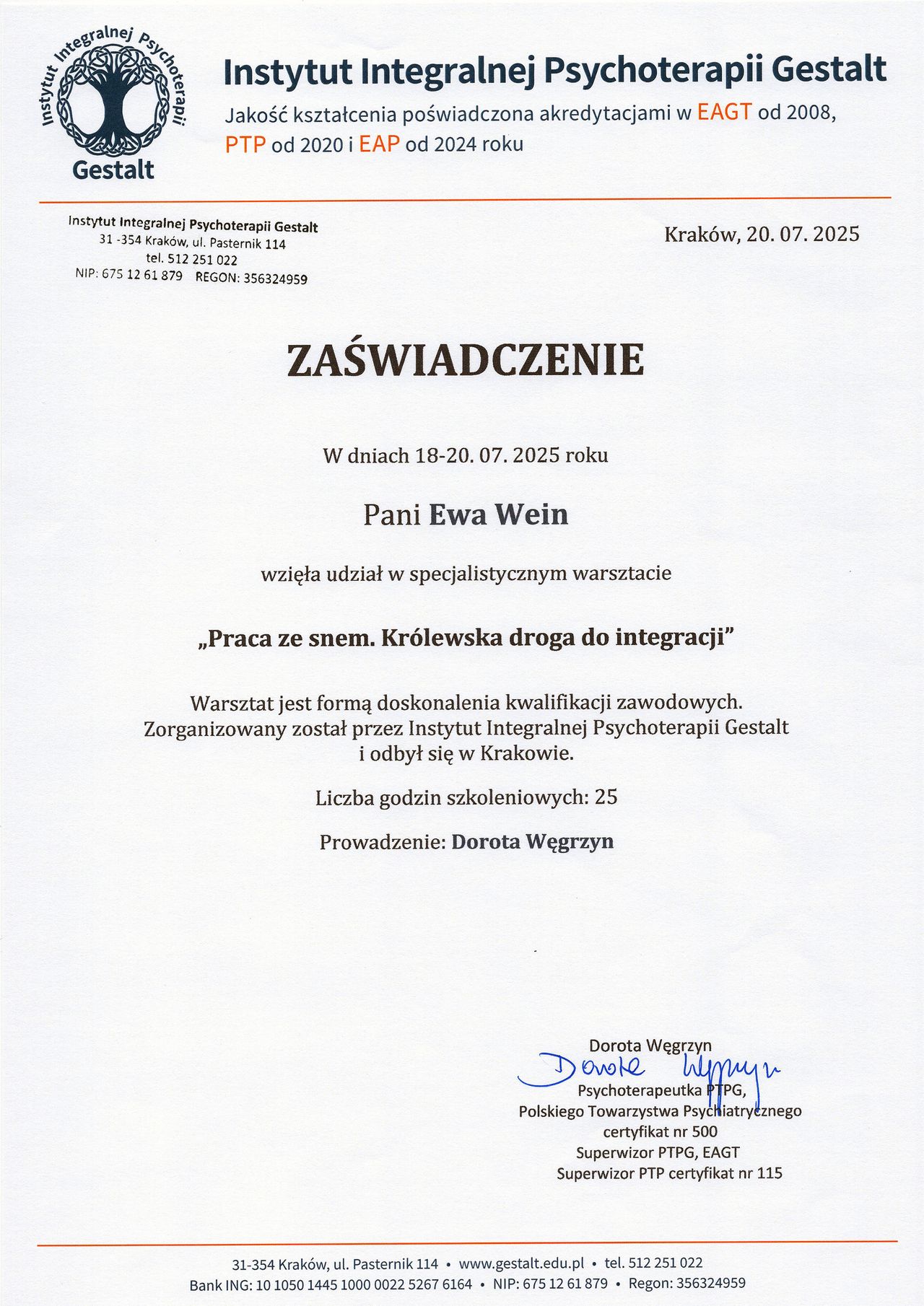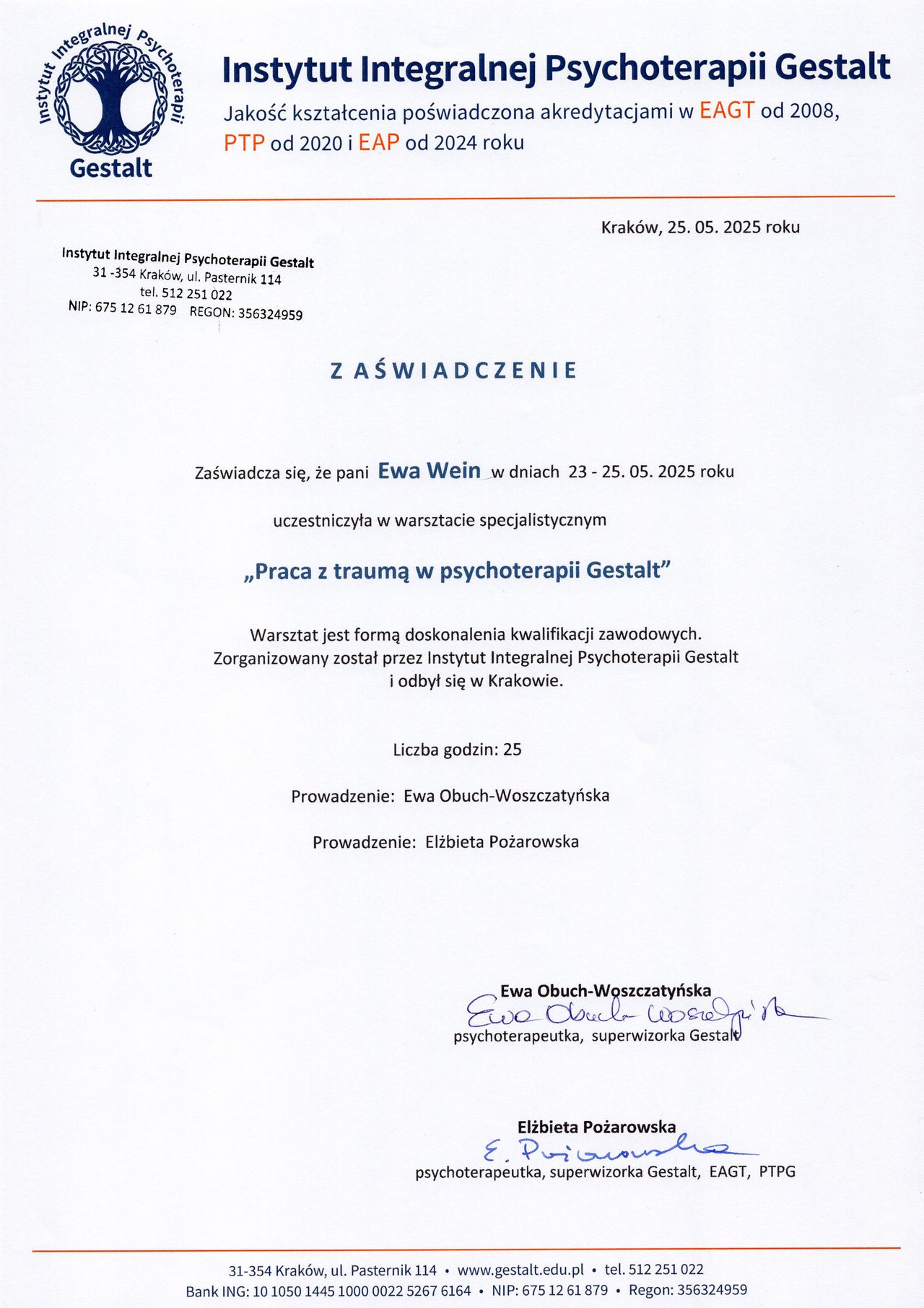 Należę do Polskiego Towarzystwa Psychoterapii Gestalt i pracuję zgodnie z Kodeksem Etycznym PTPG. Regularnie korzystam z superwizji i uczestniczę w szkoleniach.