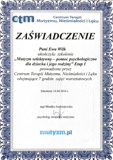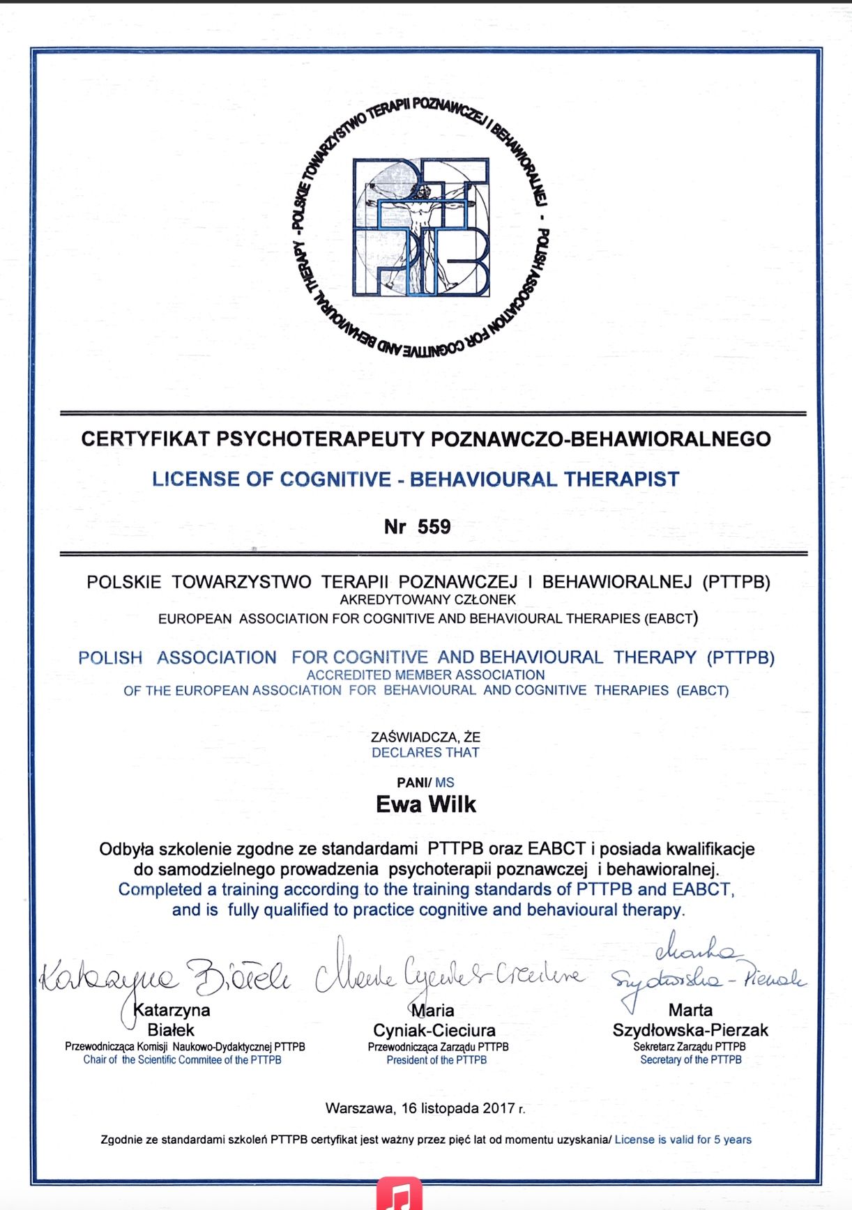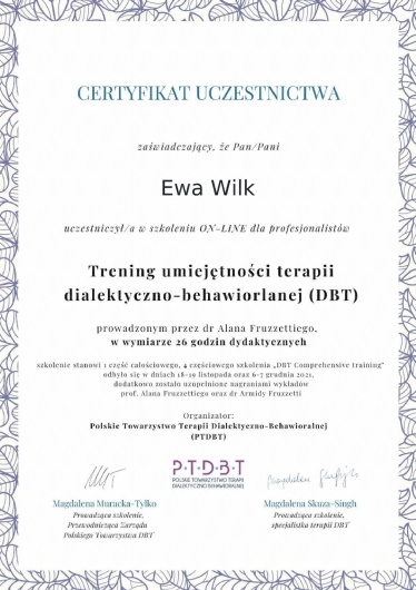 Celem jak najwyższej jakości świadczonych usług, nieustannie podnoszę swoje kwalifikacje uczestnicząc w specjalistycznych szkoleniach. Ukończyłam m.in, cykl szkoleniowy z zakresu Terapii Schematu, Studium Terapii dzieci i młodzieży, Studium Interwencji Kryzysowej, szkolenia z zakresu zaburzeń lękowych, zaburzeń nastroju. W trosce o dobro pacjentów poddaję się regularnej superwizji. Jestem członkiem Polskiego Towarzystwa Psychoterapii Poznawczej i Behawioralnej (PTPPB)