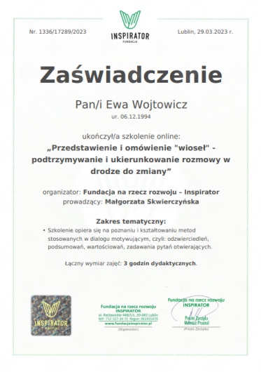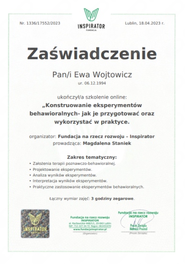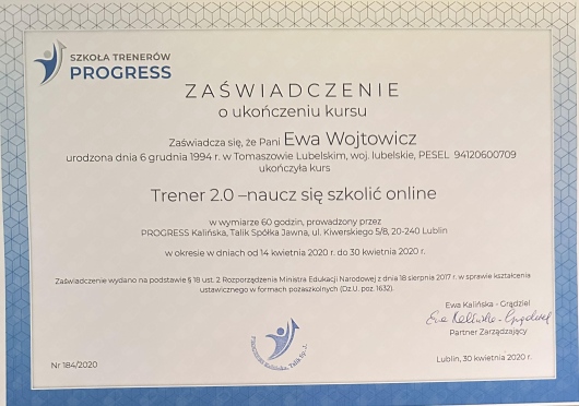 jestem psychologiem i trenerem mentalnym. Współpracuję z moimi klientami podczas konsultacji online. Prowadzę także szkolenia i warsztaty. Od kilku lat tworzę kanał Po trenersku – Ewa Wojtowicz, na którym dzielę się z ludźmi wsparciem w zakresie odkrywania swojego potencjału, zarządzania emocjami i budowania zdrowych relacji prywatnych i zawodowych.