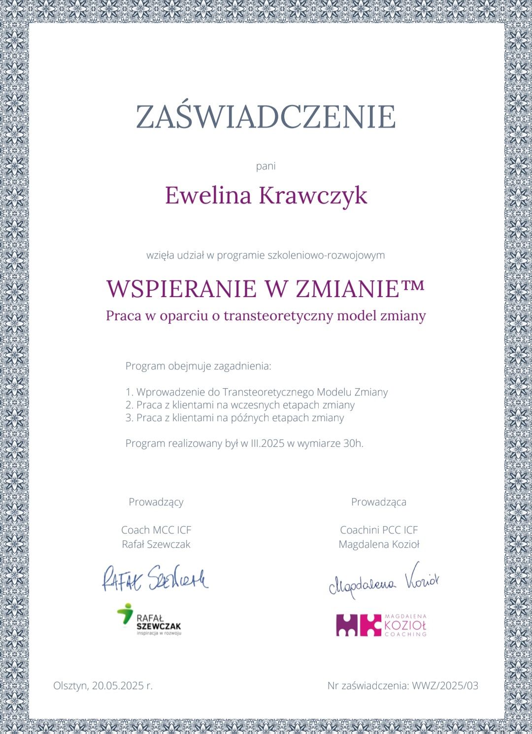 Ukończyłam liczne kursy i szkolenia w Instytucie Pozytywnej Terapii Kryzysu (IPTK), m.in. z zakresu pozytywnej odporności psychicznej, metody Stop Stres 4S oraz pierwszej pomocy psychologicznej. Aktualnie jestem w trakcie szkolenia trenerskiego z pozytywnej odporności psychicznej oraz kursu coachingowego (Studium Coacha Level I w NOVO). W swojej pracy wykorzystuję sprawdzone metody diagnostyczne oraz narzędzia zarówno z psychologii, jak i coachingu.