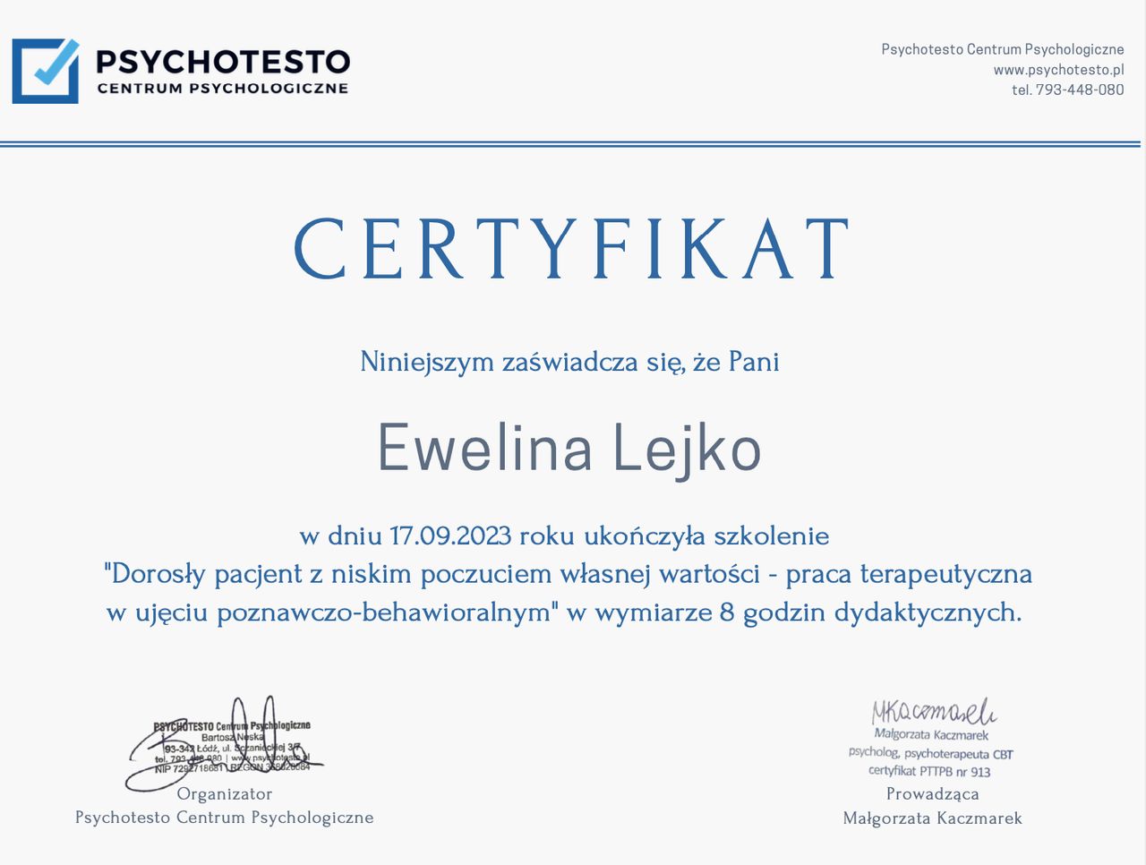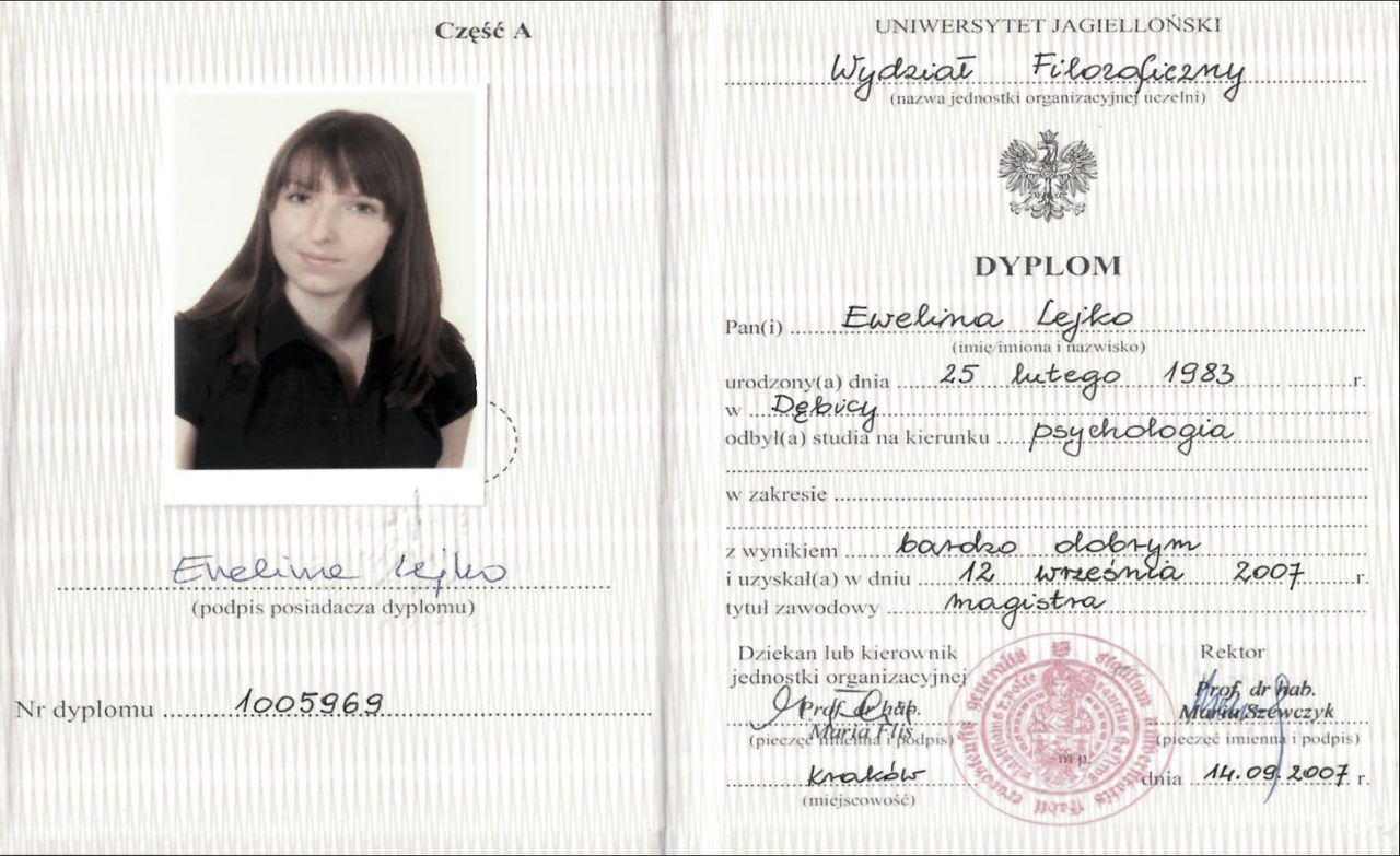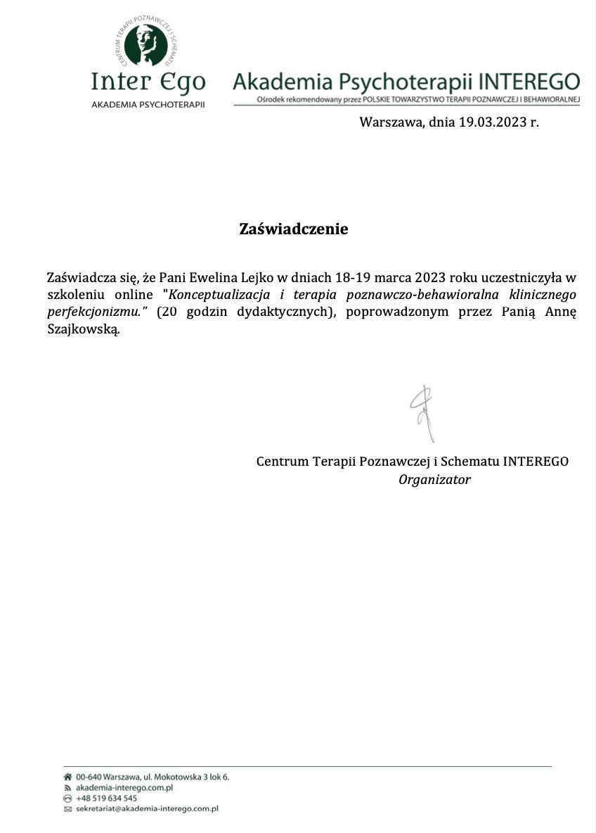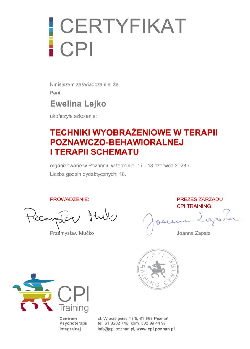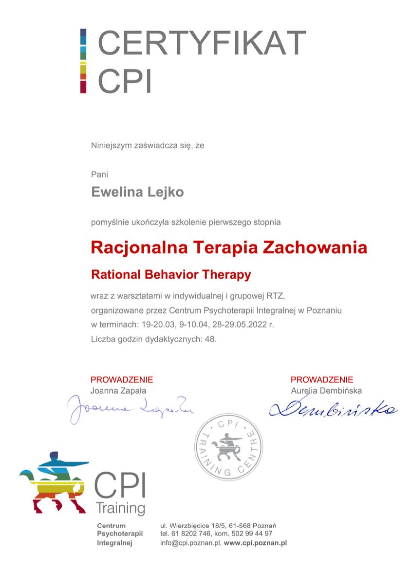 Psycholożka (nr dyplomu 1005969), psychoterapeutka w trakcie ostatniego roku 4-letniego szkolenia z psychoterapii poznawczo-behawioralnej w InterEgo w Warszawie, ośrodku rekomendowanym przez Polskie Towarzystwo Terapii Poznawczej i Behawioralnej. Absolwentka Psychologii na Uniwersytecie Jagiellońskim w Krakowie. Nieustannie się kształci i szkoli - ukończyła kurs Racjonalnej Terapii Zachowania oraz wiele szkoleń z zakresu terapii poznawczo-behawioralnej, Terapii Schematu, Terapii Dialektyczno-Behawioralnej i Dialogu Motywującego. Jest członkiem Polskiego Towarzystwa Terapii Poznawczej i Behawioralnej (PTTPB).