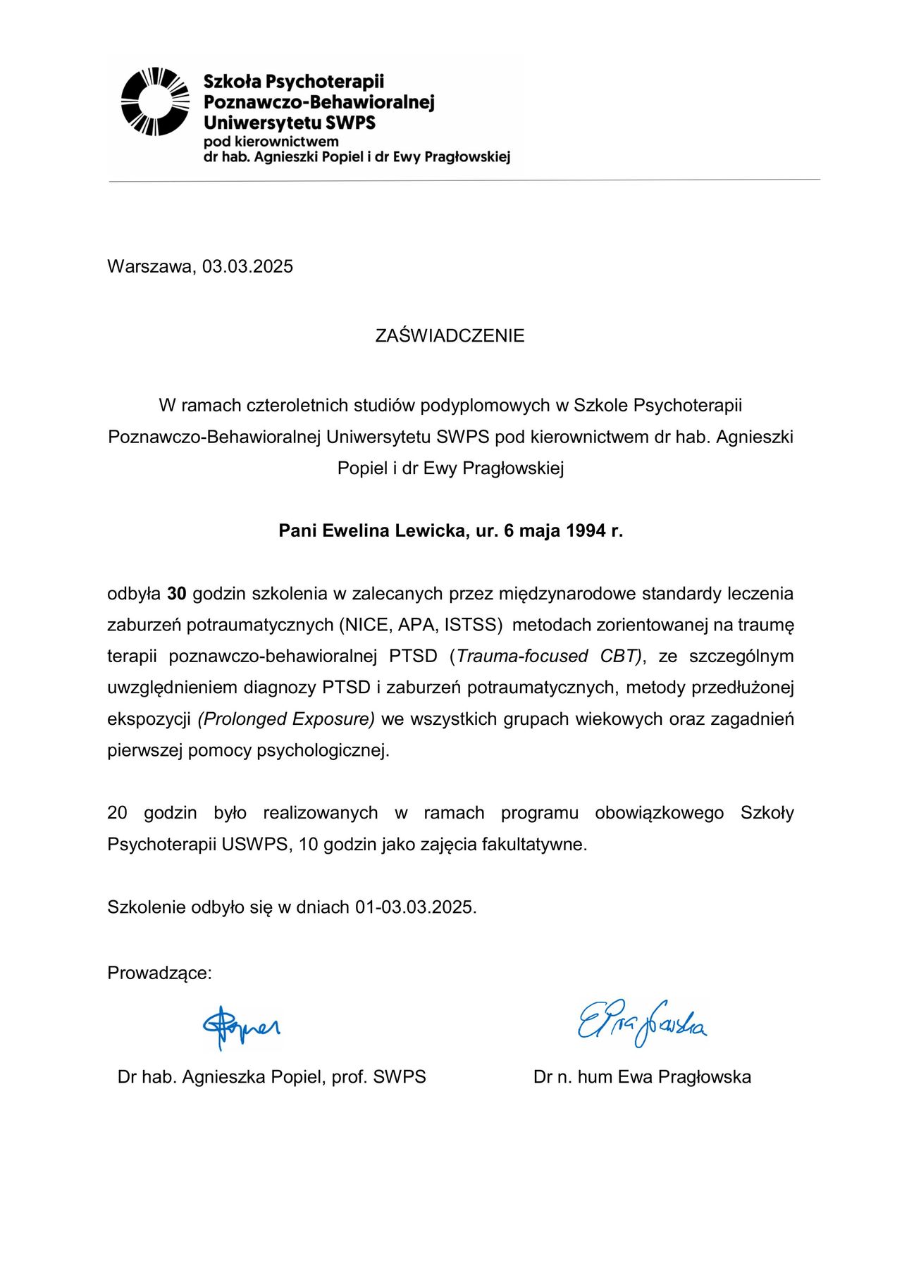 Wczoraj zakończyłam spotkania z Pania Eweliną. Szczerze polecam! To świetna specjalistka, czułam sie w pełni wysłuchana i nieoceniania. Mierzyłam się z dużymi lękami, które nie pozwalały mi spokojnie pracować. Było to moje kolejne podejście do terapii u różnych specjalistów ale dopiero u Pan i Eweliny moje ataki paniki zniknęły.