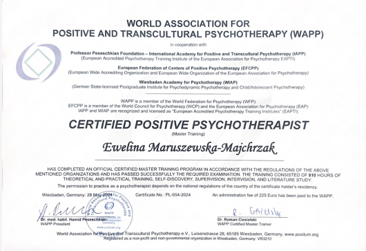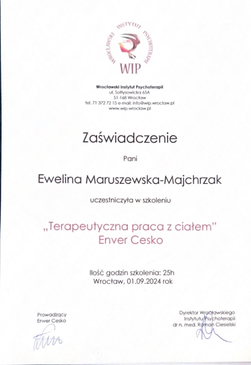 Jestem certyfikowaną psychoterapeutką, członkinią Polskiego Towarzystwa Psychoterapii Stosowanej, moja praca podlega regularnej superwizji, jestem też pedagożką specjalną.