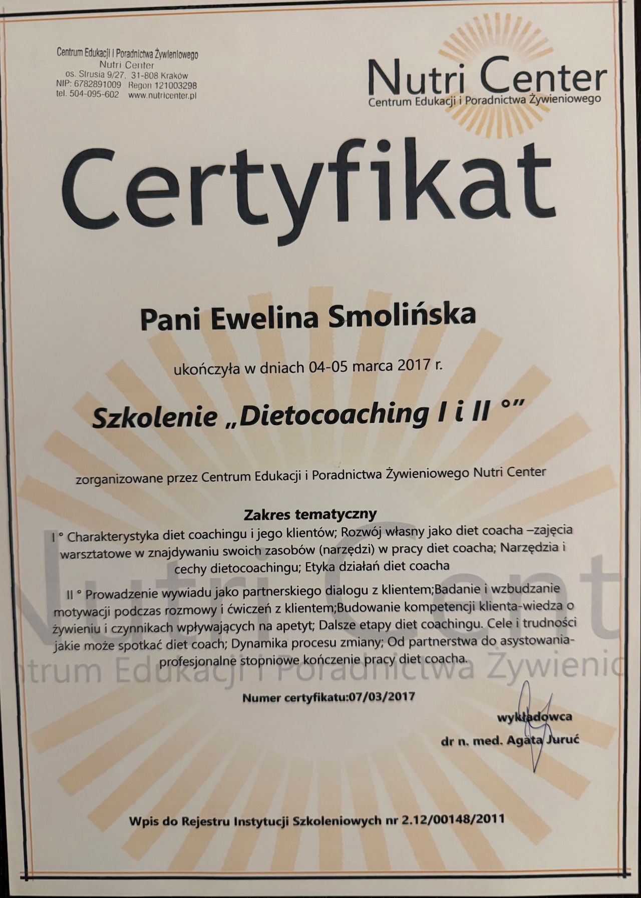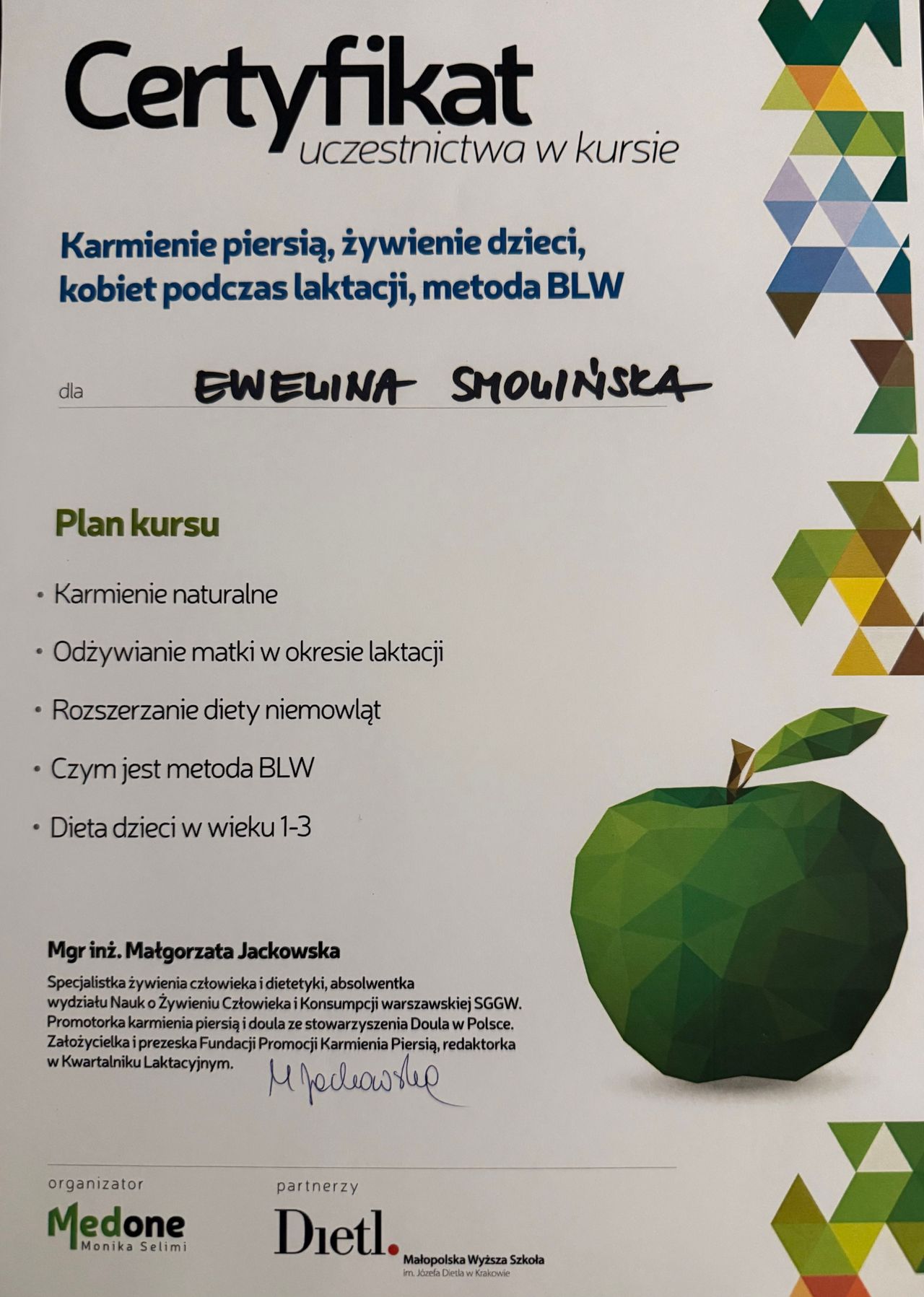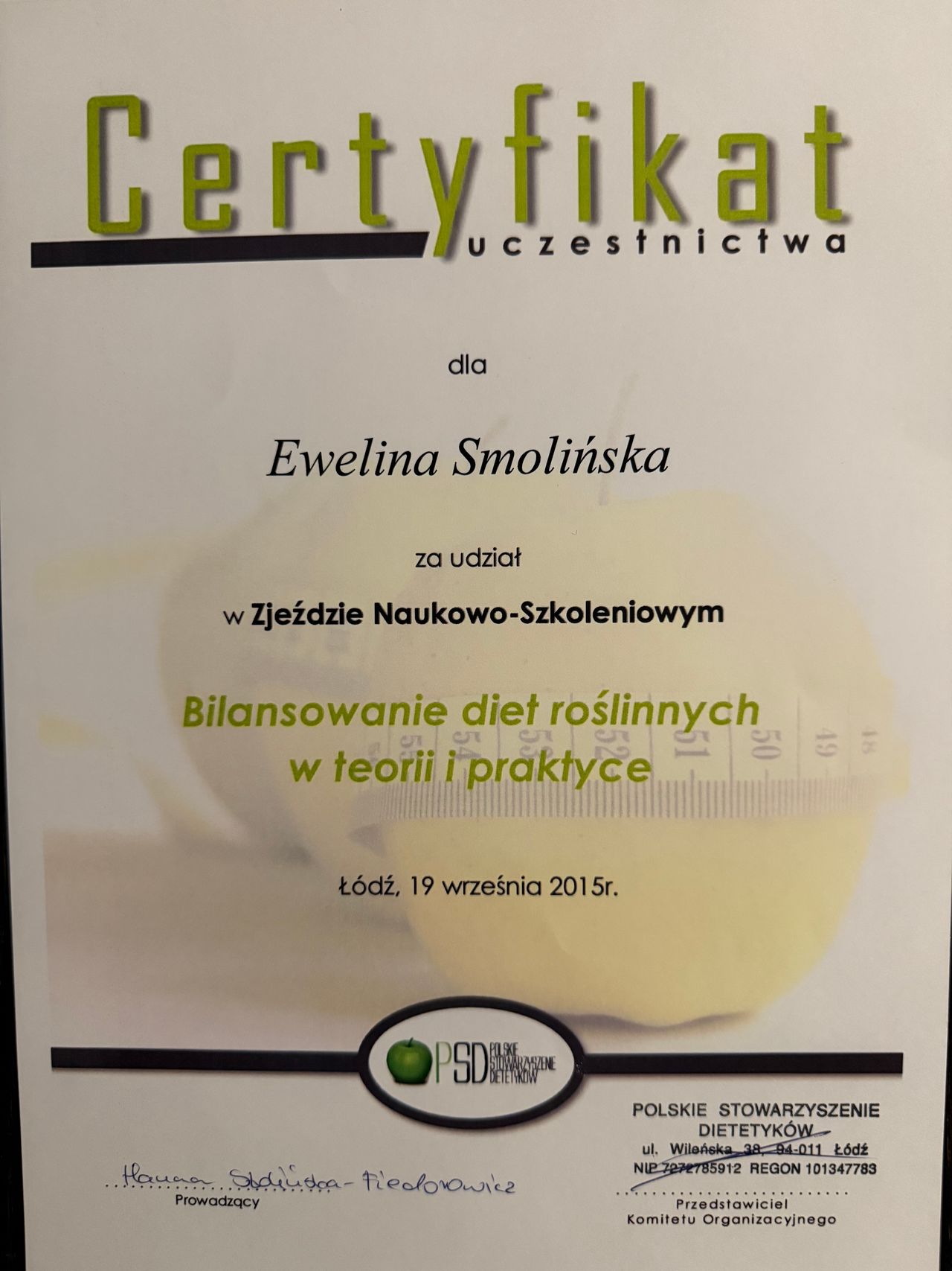 Nieustannie się rozwijam — ukończyłam liczne kursy z zakresu dietetyki sportowej, żywienia kobiet w ciąży i małych dzieci, dietcoachingu oraz diet wegetariańskich.
