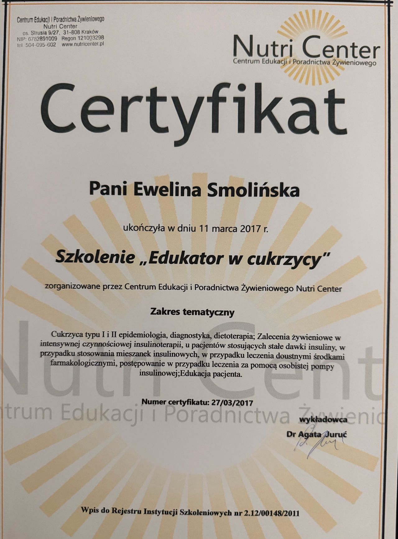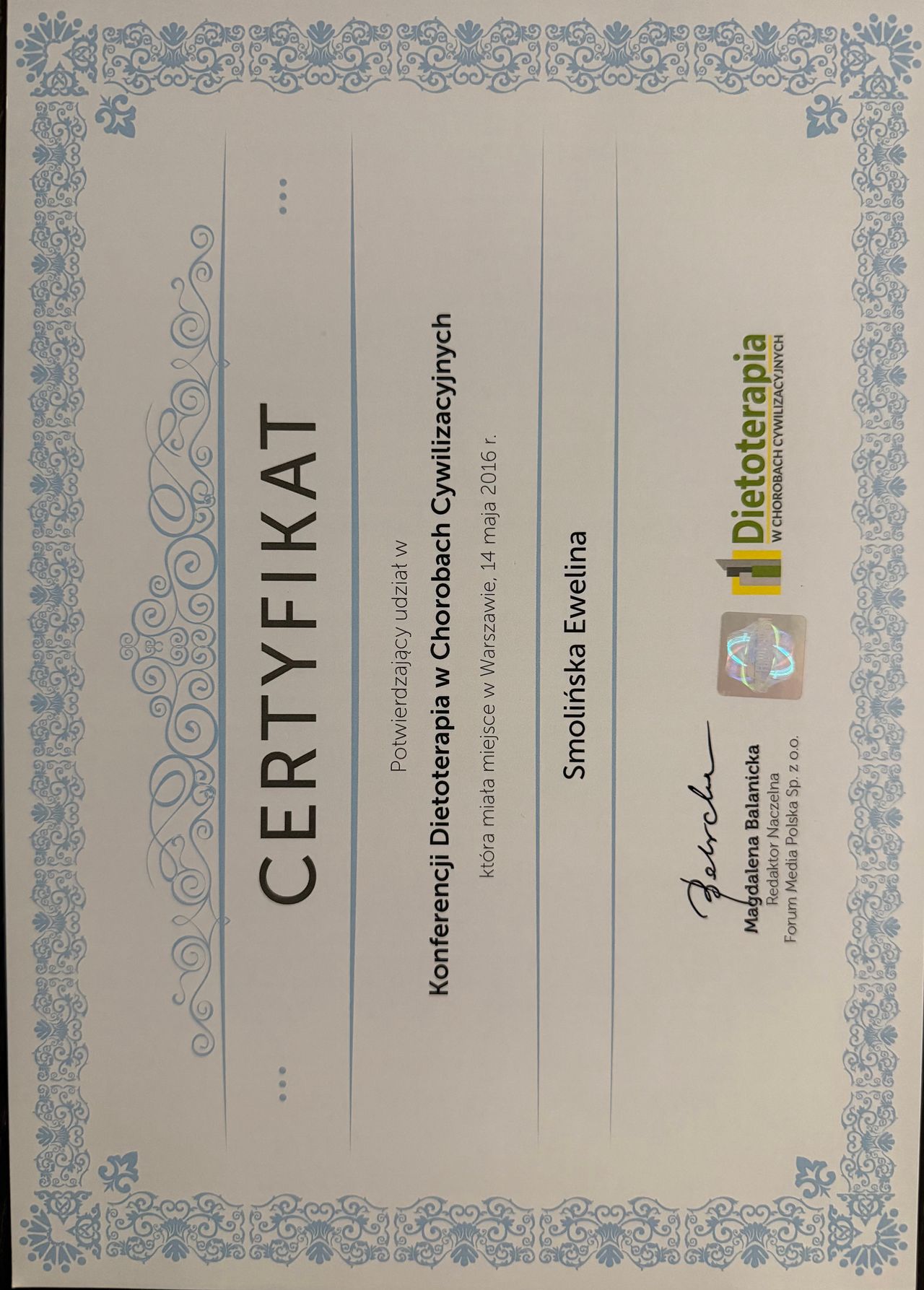 Polecam z całego serca Panią Ewelinę! Pomogła mi bardzo podczas moich zmagań z cukrzycą ciążową. Dzięki Pani Ewelinie zakończyłam głodzenie się ze strachu, że zaraz „skoczy mi cukier” a zaczęłam cieszyć się z posiłków i przede wszystkim najadać się! Po kilku wizytach Pani Ewelina nauczyła mnie jakich składników używać i jak komponować posiłki. Efekt był taki, że razem z końcem ciąży zakończyła się i moja cukrzyca przy czym usłyszałam wiele pochwał jak ładnie zadbany był cukier w ciąży - do tego właśnie dołożyła dużą cegiełkę Pani Ewelina.
