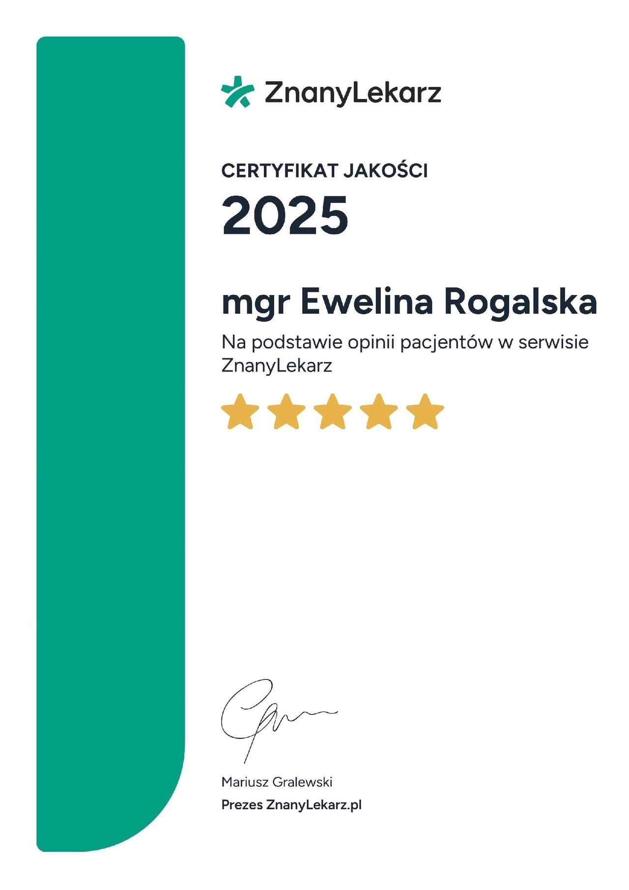 Czy Ewelina Rogalska przyjmuje online, bez konieczności pojawiania się w placówce?Tak, Ewelina Rogalska oferuje konsultacje online. Wybierz opcję „konsultacja online” przy umawianiu wizyty, a zobaczysz dostępne terminy.
