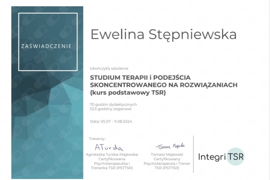 Pracuję z Panią Eweliną od 11 miesięcy i szczerze polecam. Czuję się u niej bezpiecznie i spokojnie. Pani Ewelinę wyróżnia niesamowity spokój, uważność i bezpieczna atmosfera, którą tworzy podczas każdego spotkania. Zawsze czułam duże zaangażowanie ze strony Pani Eweliny.