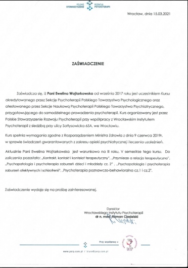 Z moją opinią czekałam od września, aby podać najbardziej szczerą opinie. Pani Ewelina jest niesamowicie empatyczna i zaangażowaną osobą - jednocześnie potrafi też konstruktywnie podać jakieś negatywy zachowań nad którymi pomaga pracować. Na każdym spotkaniu czuję, że nie tylko ktoś mnie słucha, ale zadaje takie pytania, które sklaniaja do samodzielnej refleksji i prawidlowego myślenia na swój temat, aby wyjść z depresyjnego dołka. Ogromnym atutem jest fakt, że dla Pani Eweliny liczy się przede wszystkim człowiek, nie czuje presji czasu, chociaż na każdej wizycie mija on bardzo szybko. Z każdym naszym spotkaniem zwieksza się moja uwaznosc na swoje emocje oraz organizm. Gleboko wierzę, że wiedza, doswiadczenie i dalsze zaangazowanie Pani Eweliny pozwolą mi pozbyć się destrukcyjnych myśli na swój temat/otoczenia, porzucenia schematów, które mi nie służą, wzmocnienia poczucia własnej wartości, a także odzyskaniu wewnętrznego spokoju duszy i umysłu, abym mogła bezpiecznie zejść z leków.