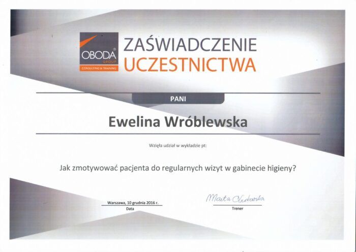 Pani Ewelina Wróblewska wykonała mi zabieg czyszczenia i piaskowania zebów. EFekt rewelacyjny, zęby nie tylko czysciutkie a wrecz duzo bielsze - jak po wybielaniu zębów! Wizyta przebiegala w milej i jednoczesnie bardzo profesjonalnej atmosferze. Pani Ewelina jest osobą bardzo zaangazowana w swoja pracę. Serdecznie polecam.