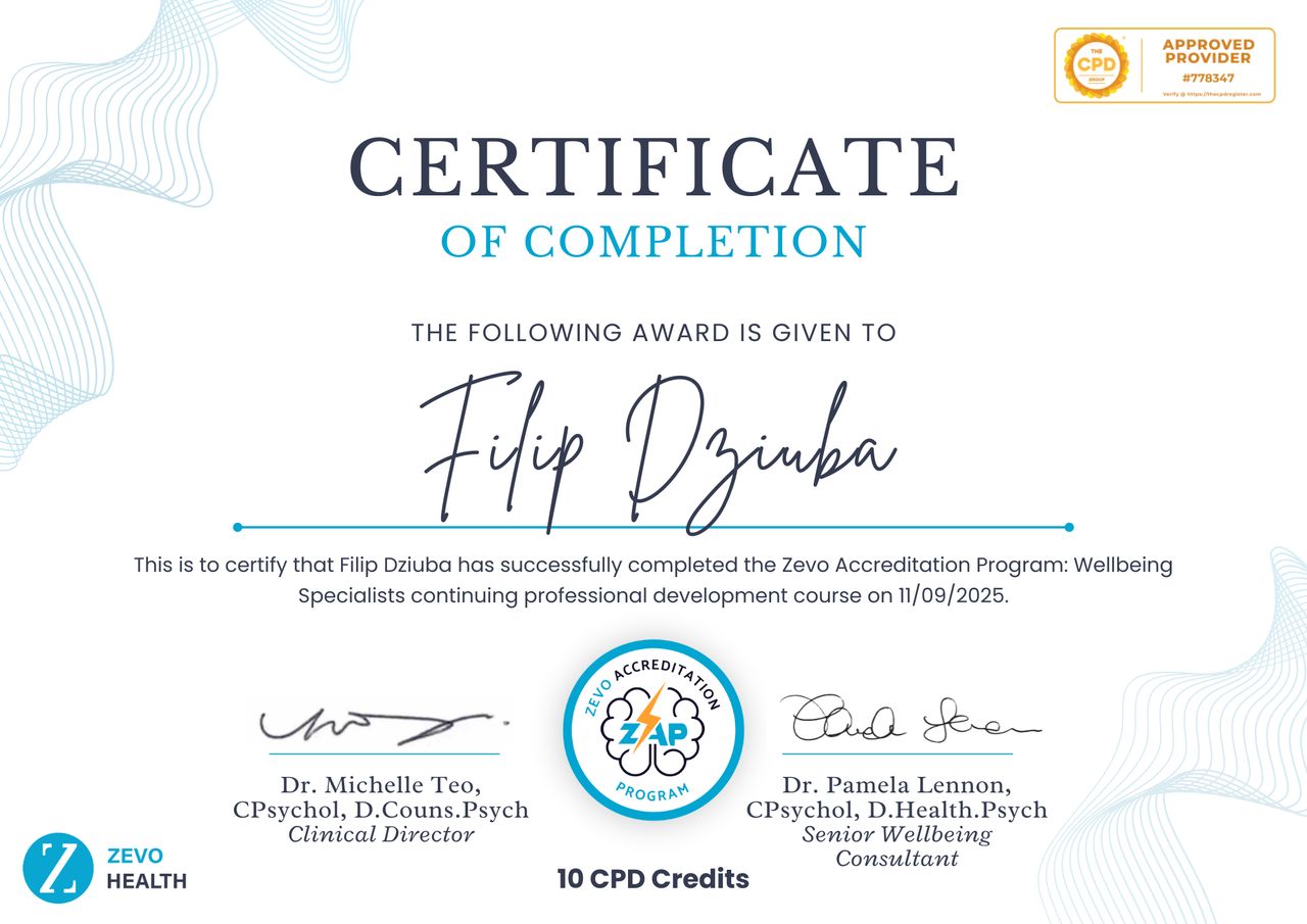 Jestem przekonany, że skuteczna pomoc psychologiczna to połączenie empatii z podejściem zorientowanym na realne efekty. Zależy mi, aby moi klienci odczuwali sens i wartość naszych spotkań. Dlatego nieustannie się rozwijam i w najbliższym czasie rozpocznę naukę w szkole psychoterapii poznawczo-behawioralnej, ze szczególnym uwzględnieniem nowoczesnego podejścia terapii schematów.