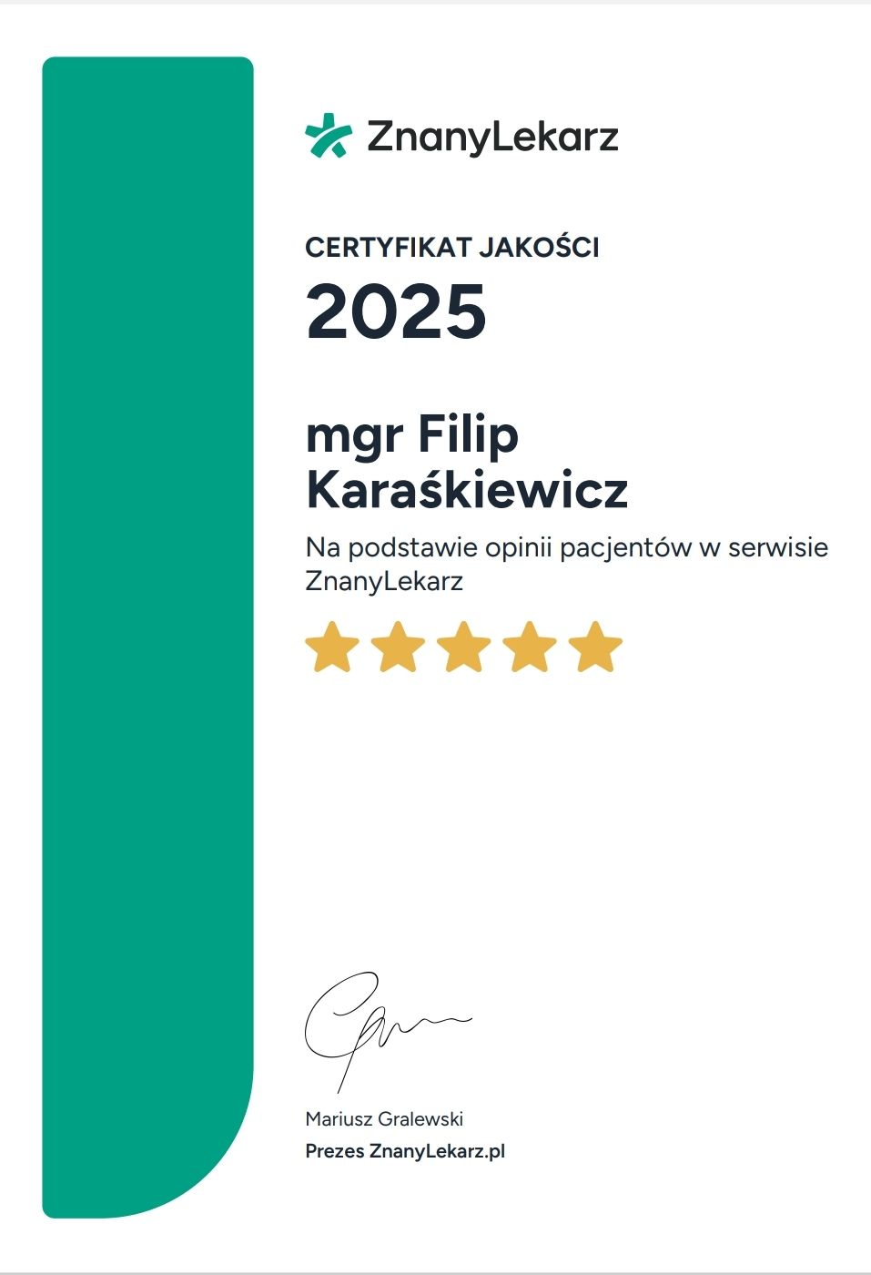 Czy Filip Karaśkiewicz przyjmuje online, bez konieczności pojawiania się w placówce?Nie, w tym momencie Filip Karaśkiewicz nie oferuje konsultacji online.