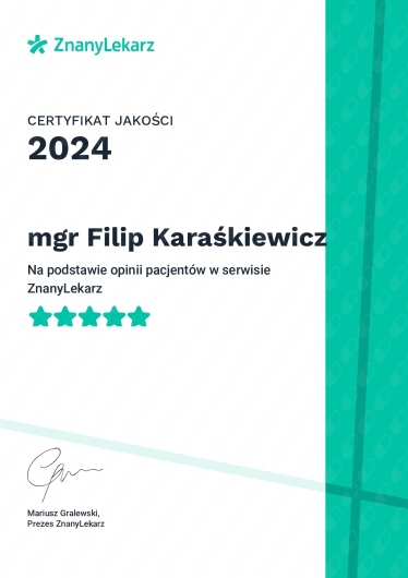Jakie ubezpieczenia akceptuje Filip Karaśkiewicz?Filip Karaśkiewicz nie przyjmuje w ramach ubezpieczenia, tylko w ramach płatnych wizyt prywatnych. W razie wątpliwości zalecamy kontakt ze specjalistą.