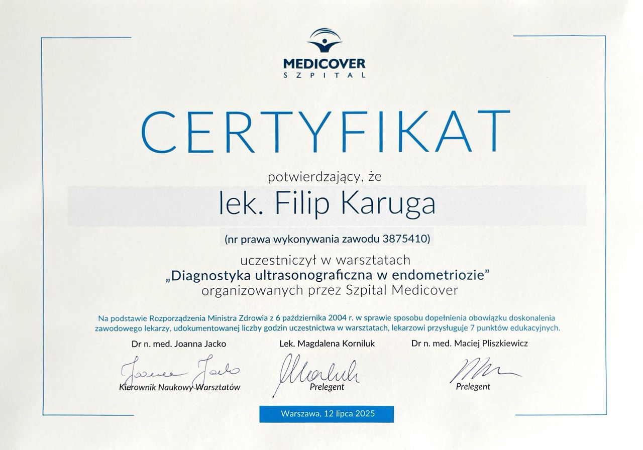 Jestem absolwentem Uniwersytetu Medycznego w Łodzi oraz doktorantem Międzynarodowej Szkoły Doktorskiej. Pracuję na Oddziale Ginekologiczno-Położniczym Szpitala Bielańskiego w Warszawie jako lekarz rezydent.