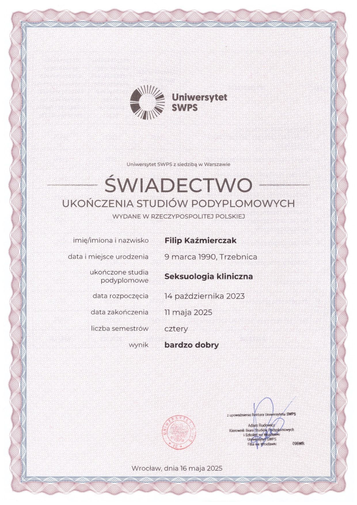 Swoją wiedzę psychologiczną zdobywałem w ramach 5-letnich studiów magisterskich na Uniwersytecie SWPS, który jest wiodącym ośrodkiem naukowym z zakresu psychologii w Europie. Cały czas rozwijam swoje kompetencje za pomocą szkoleń i dodatkowych studiów, jak. np. seksuologia kliniczna. Jestem psychoterapeutą w trakcie szkolenia w nurcie poznawczo-behawioralnym (CBT). Jestem członkiem Polskiego Towarzystwa Terapii Poznawczej i Behawioralnej (PTTPB) oraz Polskiego Towarzystwa Seksuologicznego (PTS). Pracuję indywidualnie, z parami oraz rodzinami. Zajmuje się takimi tematami, jak kryzysy emocjonalne, problemy w parach oraz rodzinach, depresja, zaburzenia odżywiania, lęk, objawami przewlekłego stresu oraz wszelakiego rodzaju problemami natury seksualnej człowieka. Zajmuję się również diagnozą ADHD u osób dorosłych oraz wsparciu w tym temacie. Mój gabinet to przyjazna przestrzeń, w której każdy może poczuć się swobodnie i bezpiecznie, niezależnie od tego jakie problemy spotkały Cię w Twoim życiu. Moje podejście opiera się na szacunku, zrozumieniu i profesjonalizmie. Zapraszam do mojego gabinetu, gdzie wspólnie będziemy pracować nad osiągnięciem Twoich celów i poprawą jakości życia.
