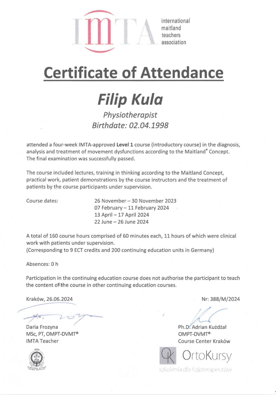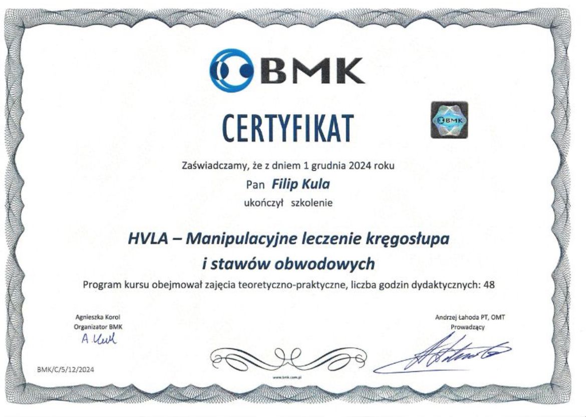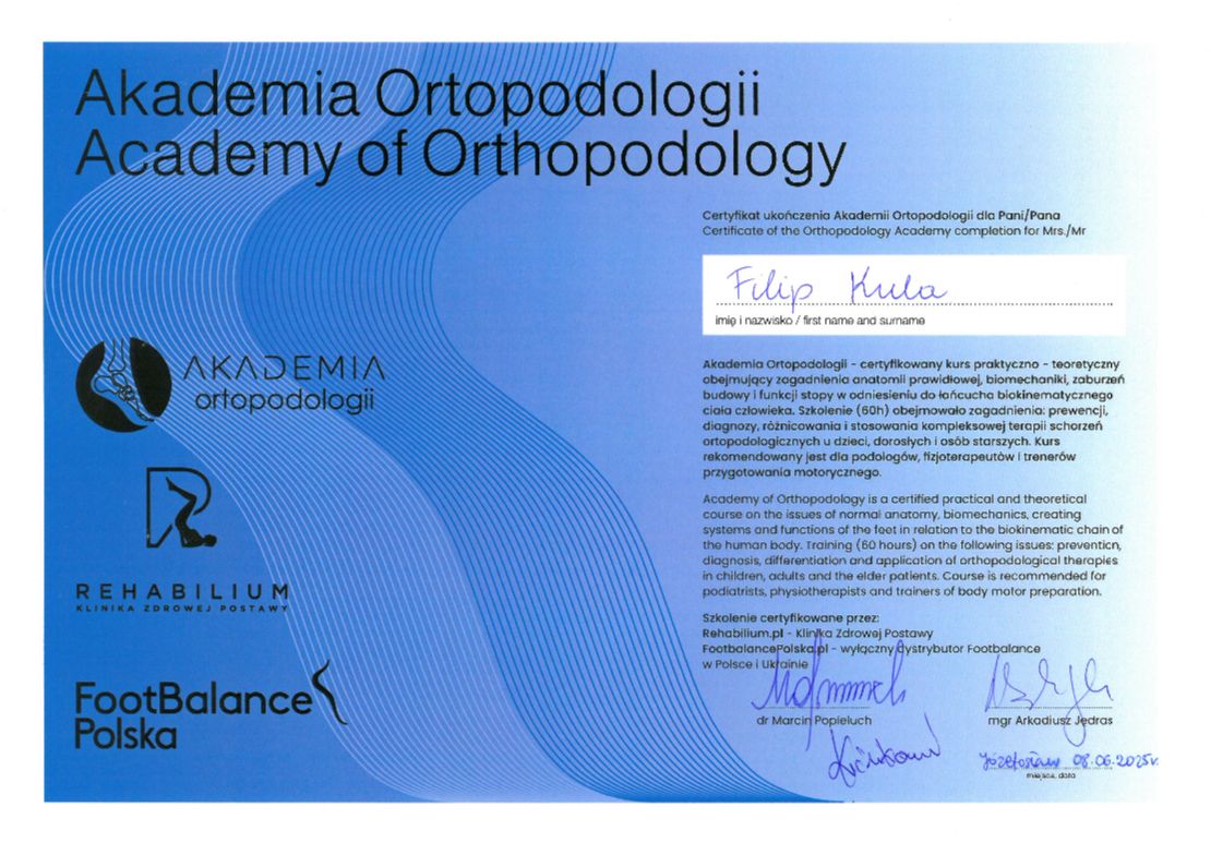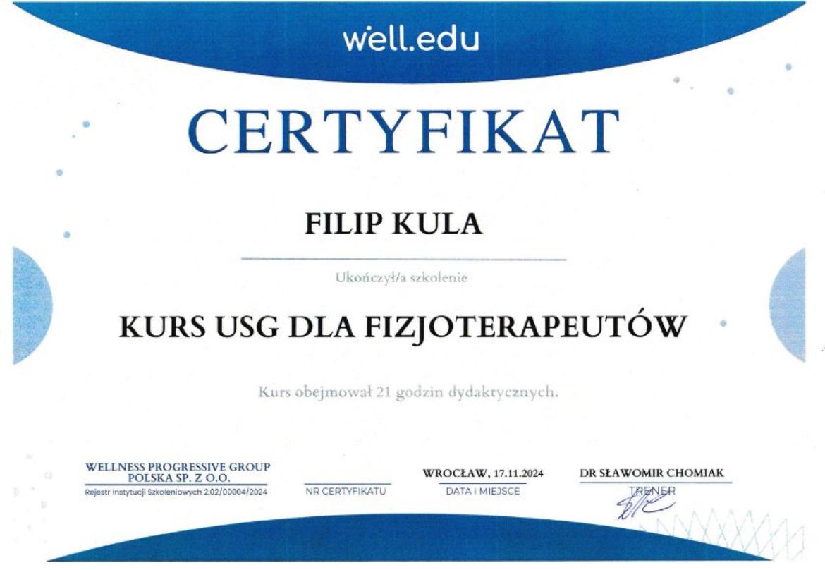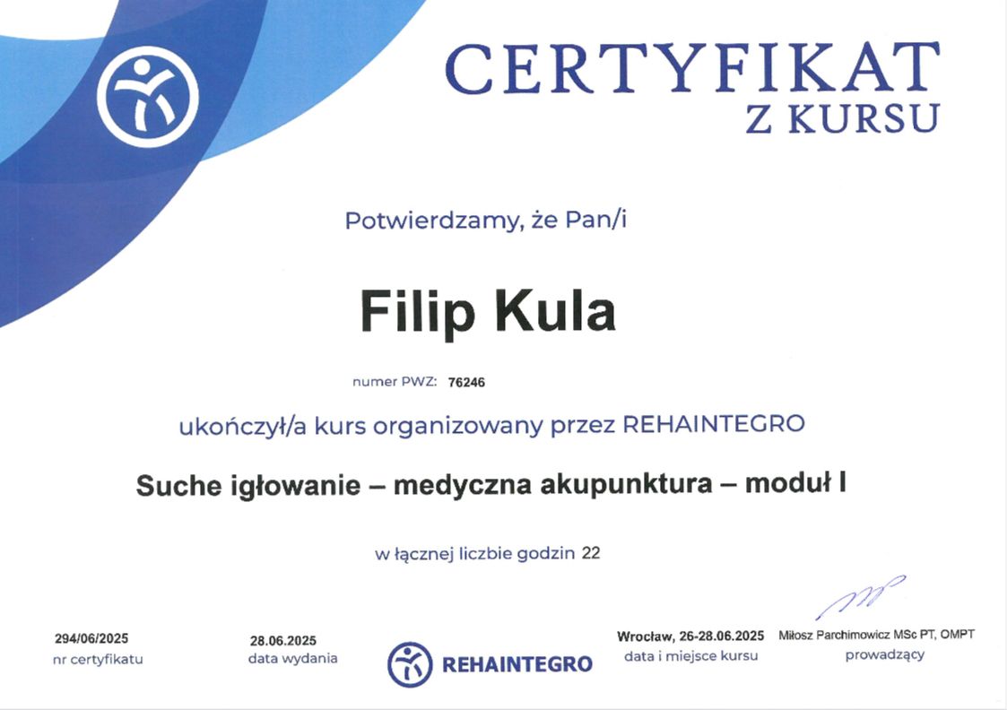 Filip jest wybitnym fizjoterapeutą, do każdego przypadku podchodzi indywidualnie, z pełnym zaangażowaniem i empatią, bierze pod uwagę aktywności pacjenta i dobiera ćwiczenia mające na celu wyeliminowanie bólu oraz wzmocnienie tych partii, które cierpią podczas danych aktywności, doradzi również w kwestii treningów i rehabilitacji.