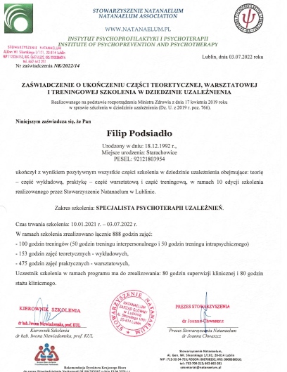 Dodatkowo ukończyłem studium podyplomowe w zakresie przygotowania pedagogicznego, zrealizowałem także staż w Szpitalu Neuropsychiatrycznym, gdzie pracowałem na dziennym oddziale psychiatrycznym, wspierając osoby z zaburzeniami emocjonalnymi i poznawczymi. W czasie odbywania stażu, prowadziłem zajęcia terapeutyczne indywidualne oraz grupowe.