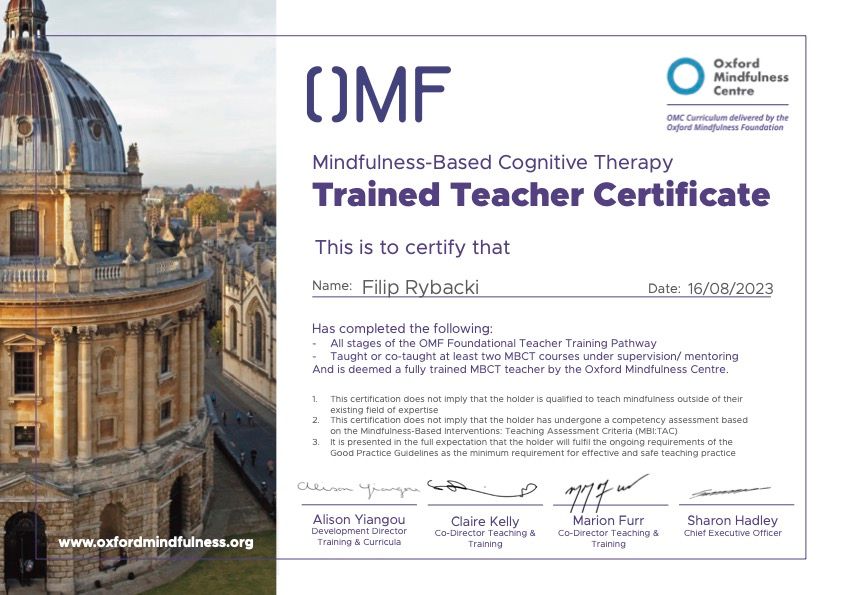 Uważność (Mindfulness) z Uniwersytetu Oksfordzkiego – Jako nauczyciel metody MBCT, pomagam odnajdywać spokój i uczyć się akceptacji tego, co przynosi codzienność. To proste narzędzia, które pomagają radzić sobie z natłokiem myśli i stresem.