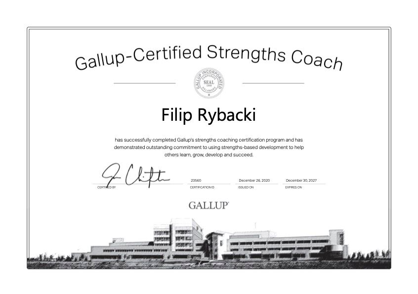 Talenty i potencjał (Instytut Gallupa) – Certyfikacja Gallup-Certified Strengths Coach pozwala mi wspierać Cię w odkrywaniu Twoich naturalnych zasobów. Wierzę, że terapia to nie tylko praca z trudnością, ale też budowanie na tym, co w Tobie najsilniejsze.